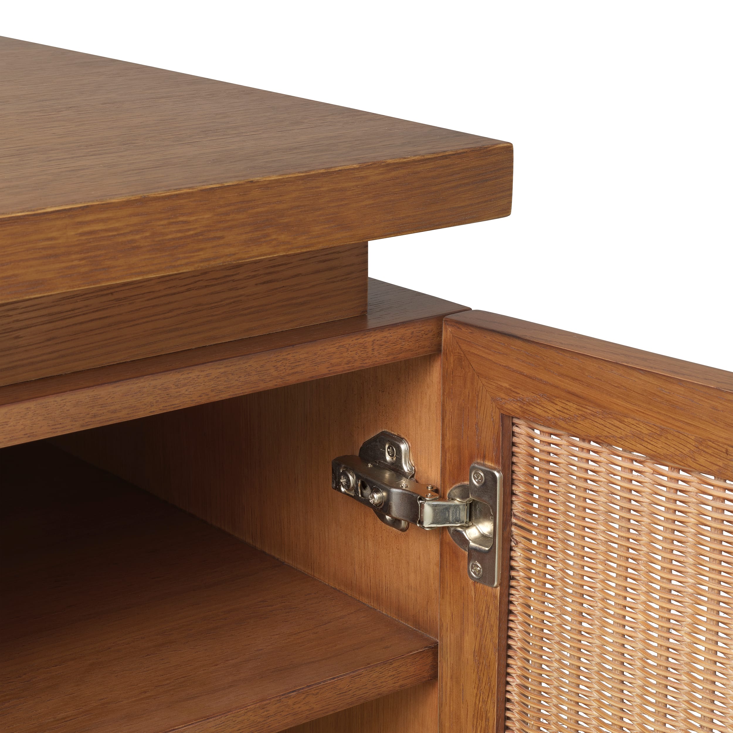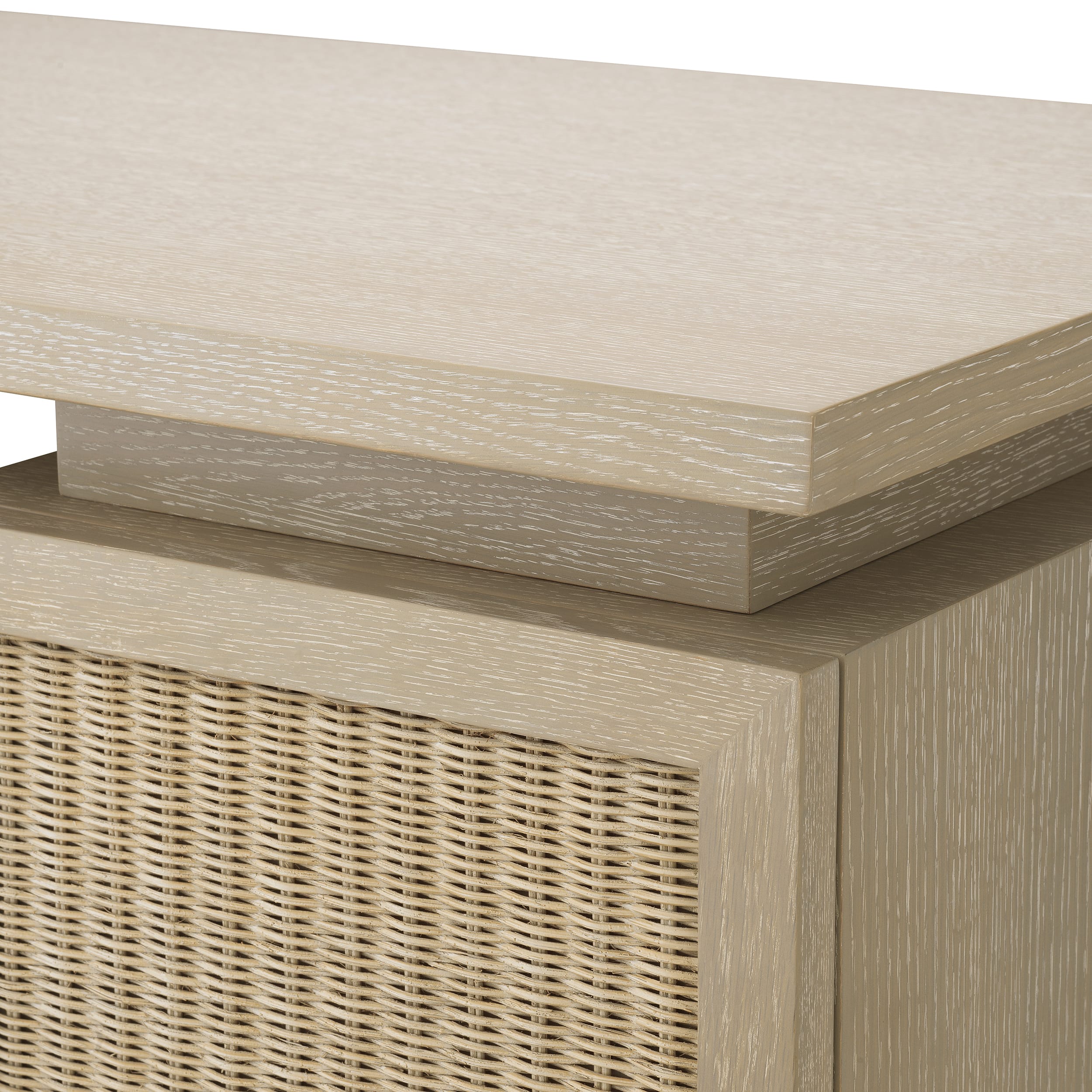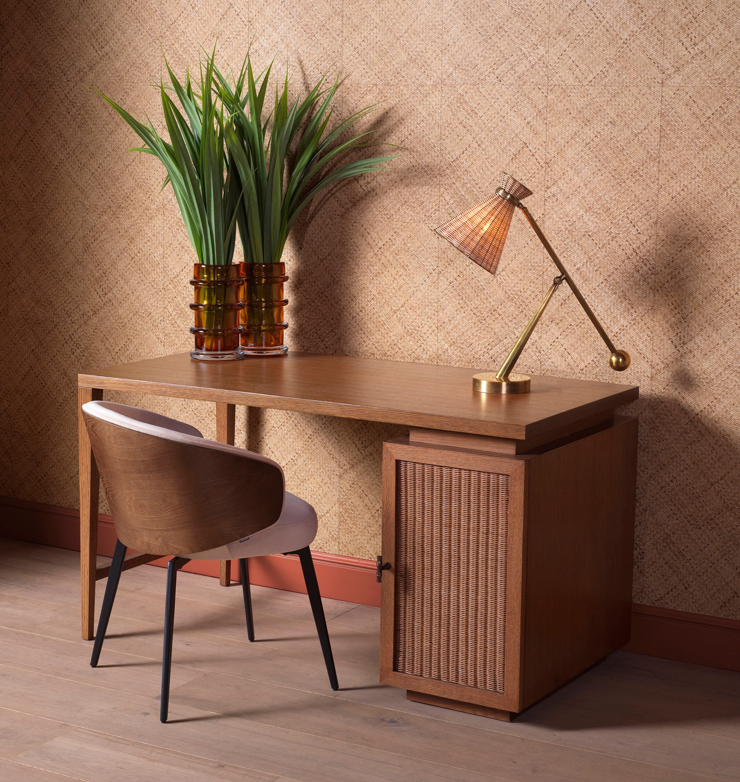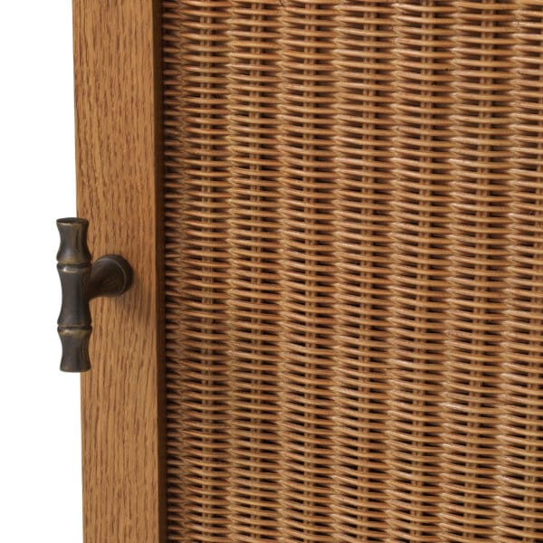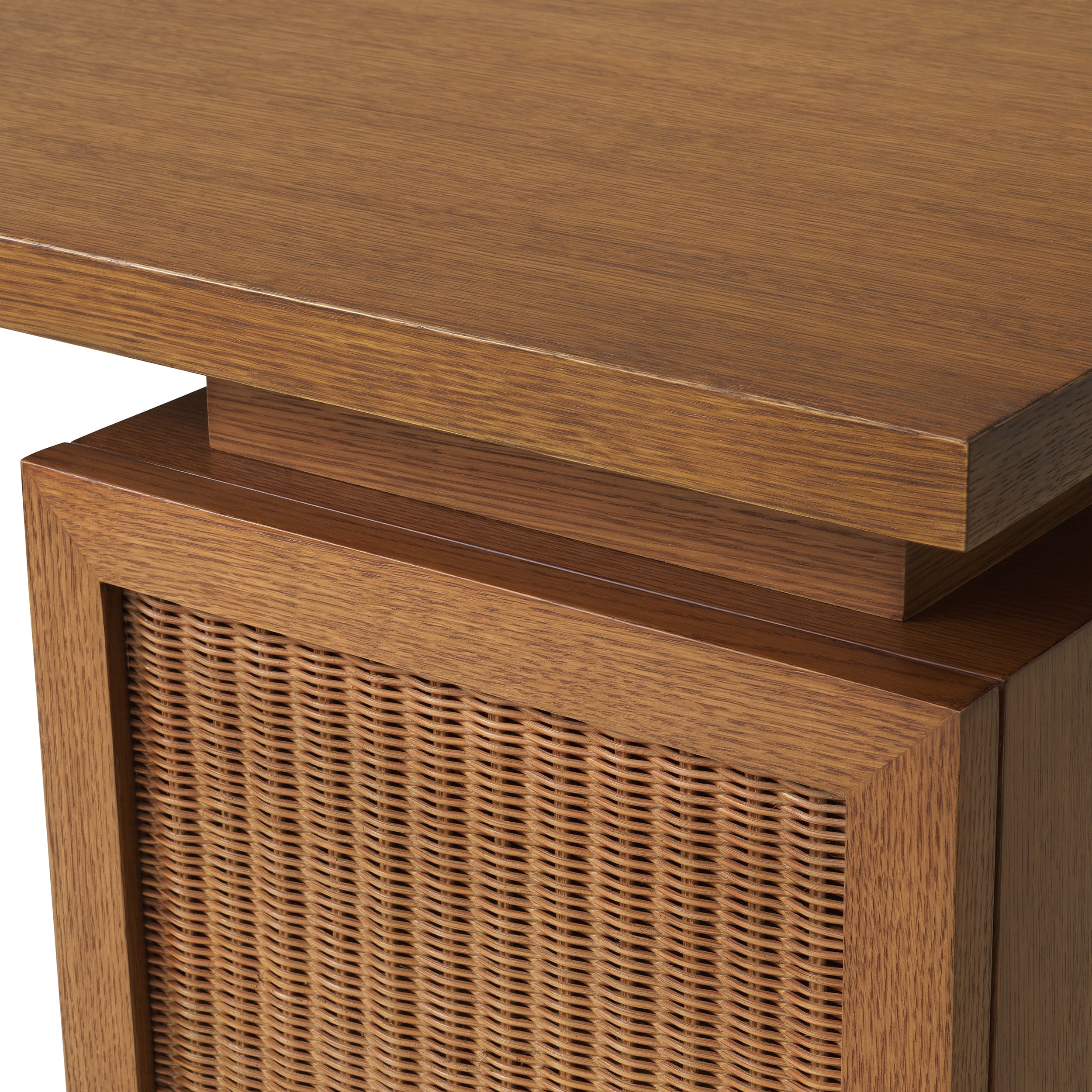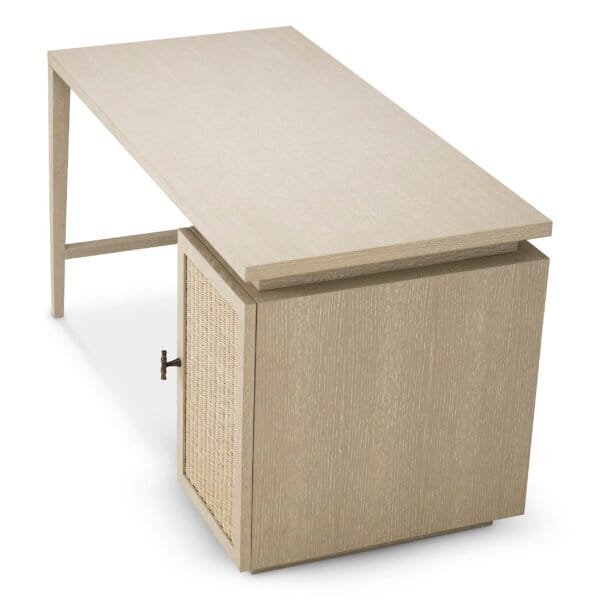 Realizat din furnir de stejar și pus în valoare de panouri din ratan împletit, biroul are un finisaj mat care subliniază tonurile autentice ale lemnului. Mixul armonios de texturi și designul modern, evidențiază materiale premium, transformând această piesă în elementul central ideal pentru interioare actuale, cu un stil organic și sofisticat.