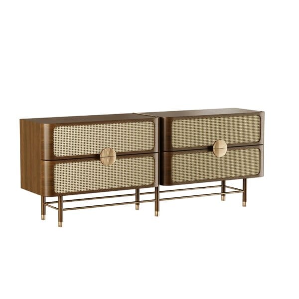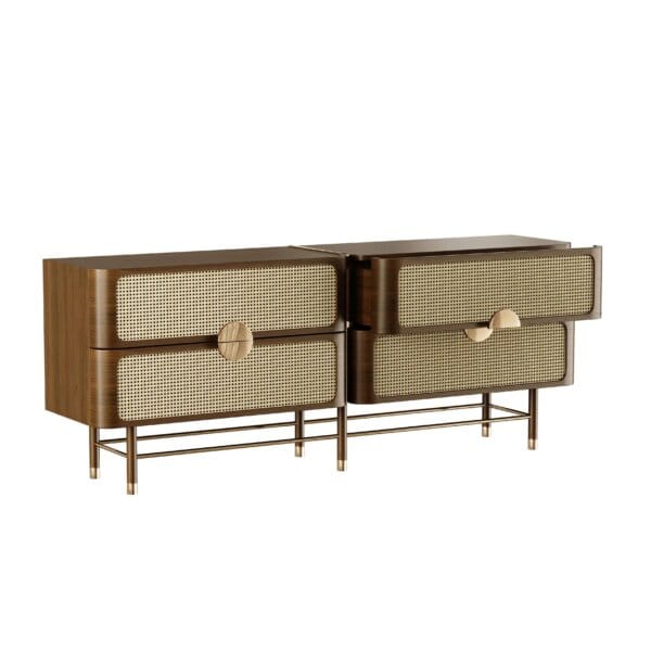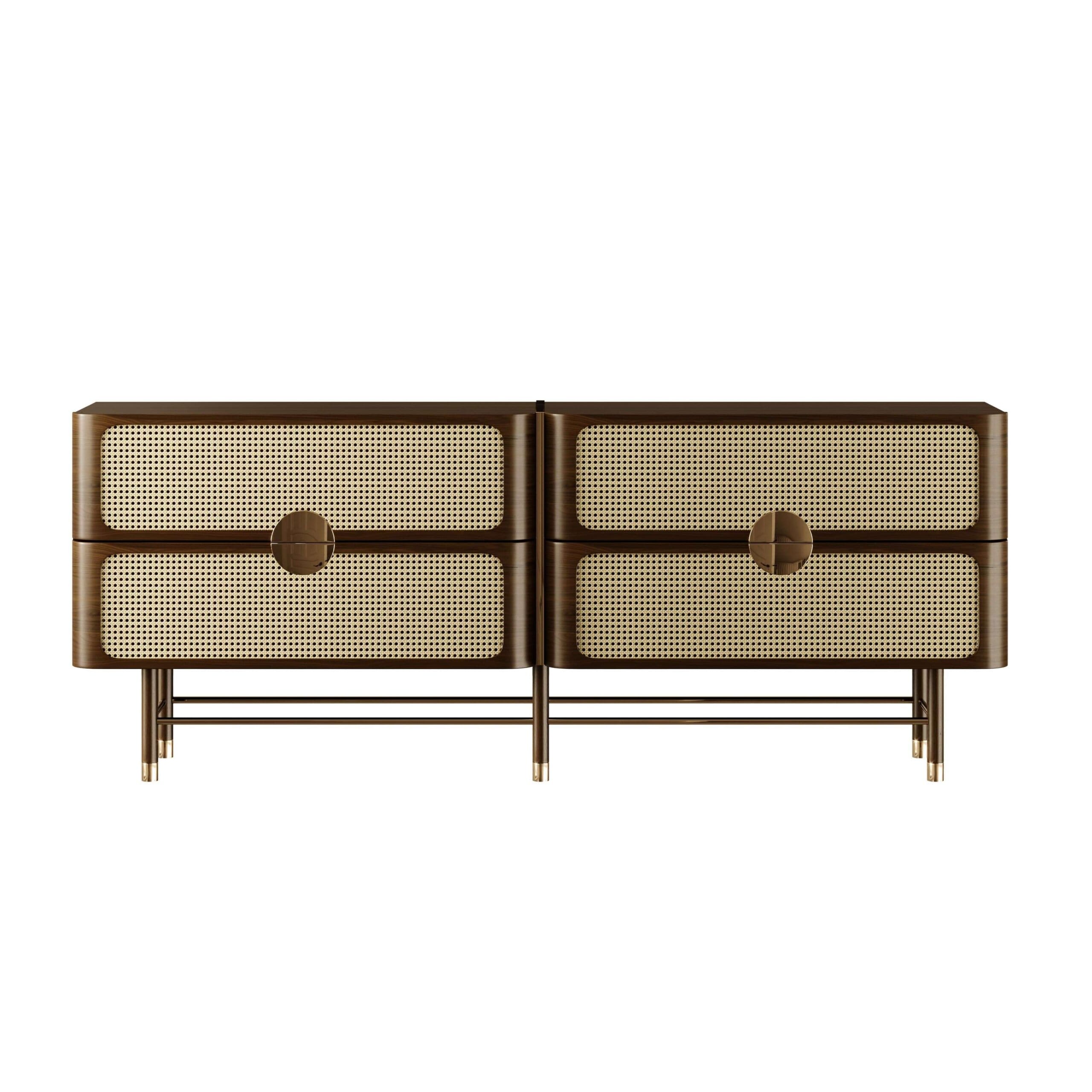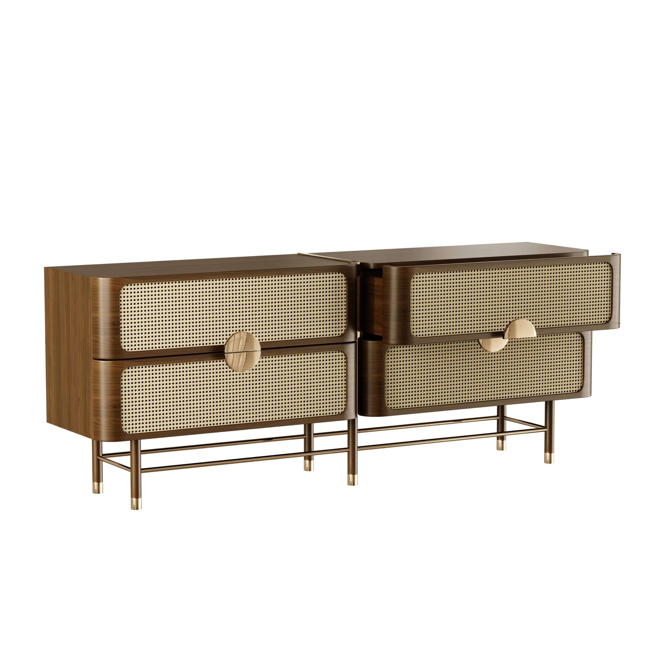 Bufetul Cole reușește să îmbine cu rafinament alamă, ratan și lemn de nuc, oferind un design elegant și sofisticat. Forma sa dreptunghiulară se sprijină pe picioare robuste din lemn, care adaugă un plus de stabilitate și îi conferă un look atractiv, perfect pentru a aduce un plus de caracter oricărui interior.