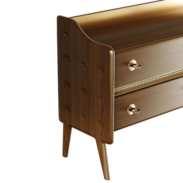Materiale și finisaje: Lemn de nuc mat, alamă lustruită, alamă periată și ratan.