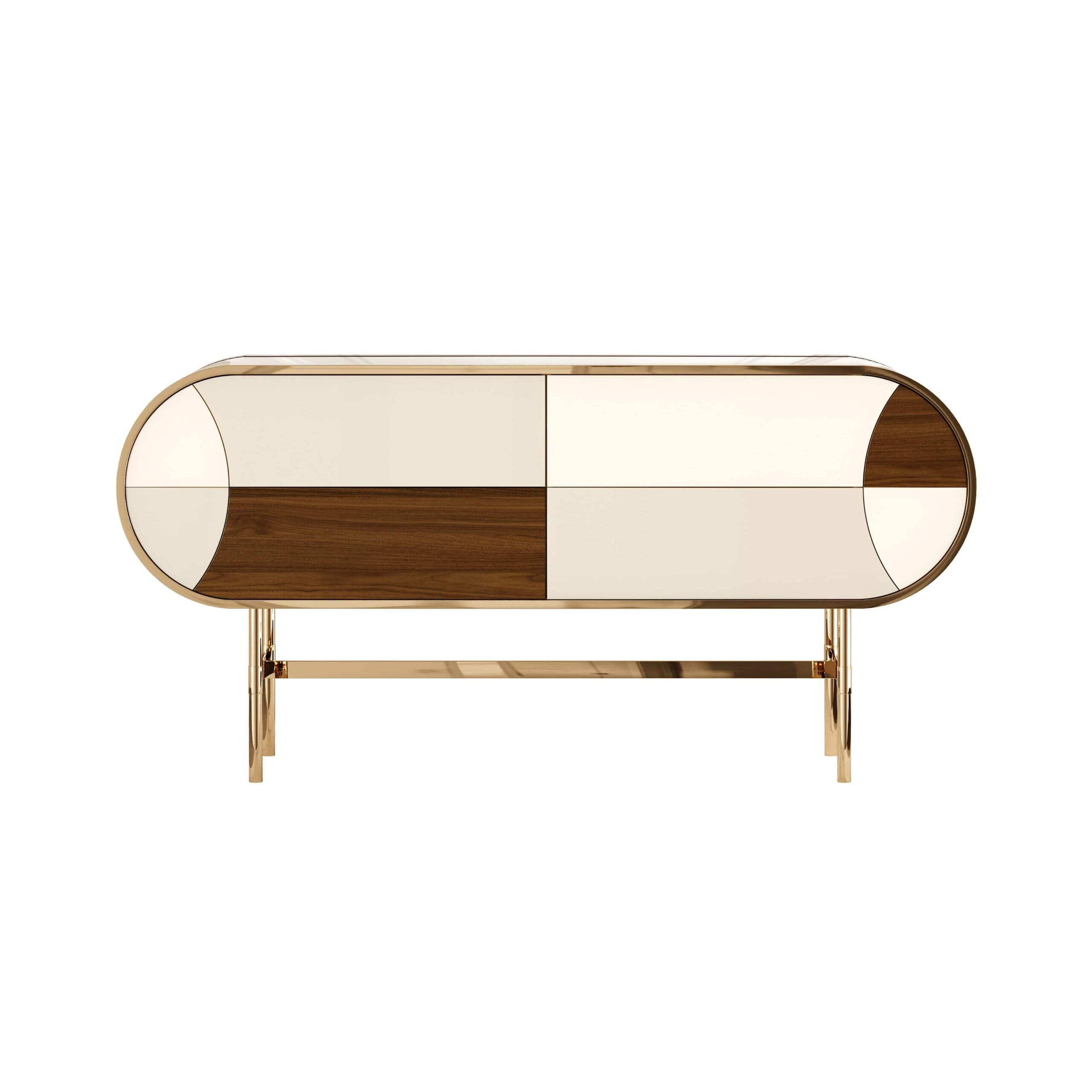 Bufetul Retro Moryson, cu un design vintage, reprezintă o reinterpretare a bufetului Moryson. Inspirat de designul retro mid-century, această piesă distinctivă promite să adauge o notă de stil oricărui living. Structura de susținere este realizată din alamă placată cu aur, având un cadru tubular, armonios îmbinat cu culori lăcuite, la modă.