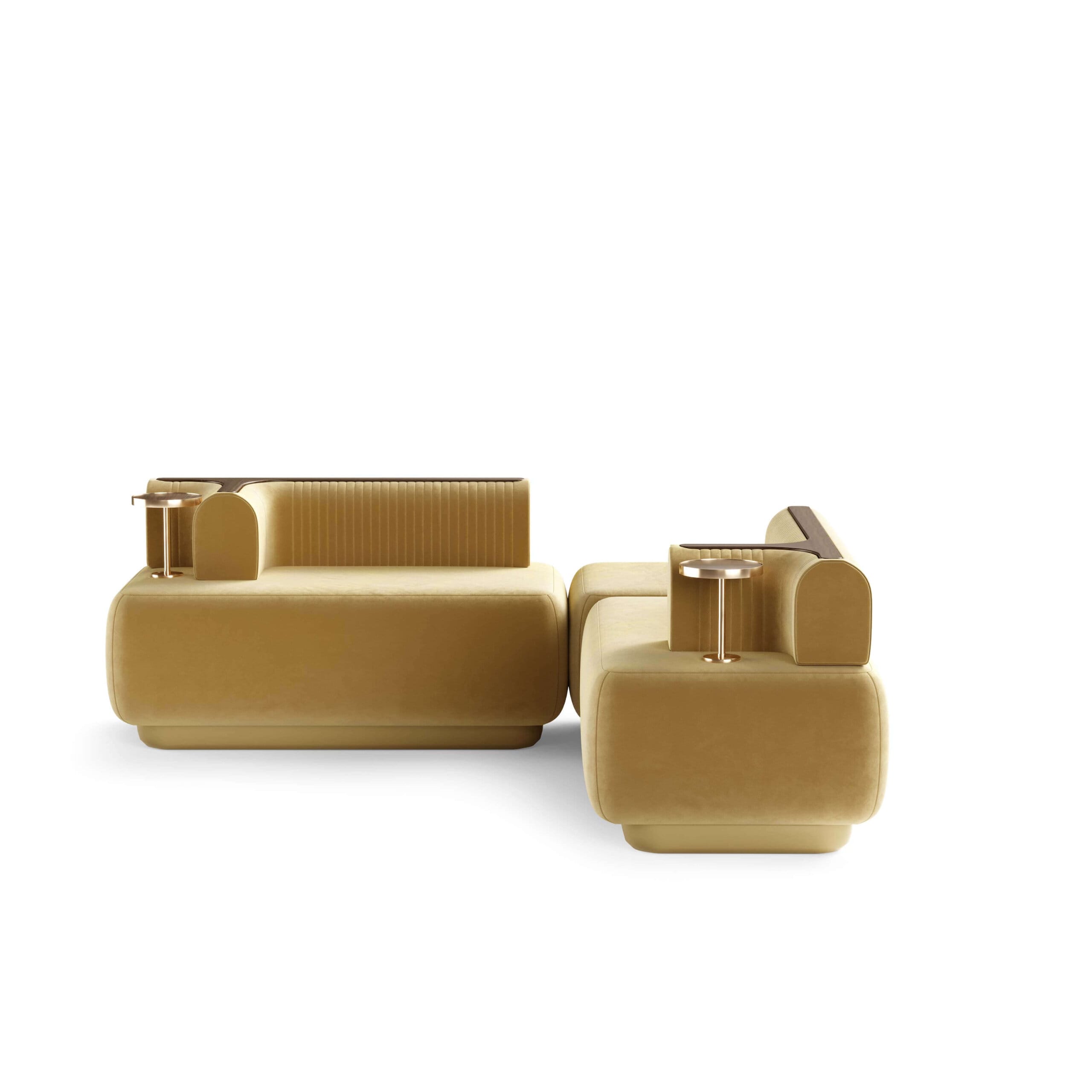 Canapeaua Lauren îmbină armonios estetica mid-century cu funcționalitatea contemporană. Cu linii echilibrate și detalii rafinate, această piesă se remarcă prin masa laterală integrată, realizată din alamă lustruită – ideală pentru a susține o băutură sau un obiect decorativ. Spătarul este evidențiat prin inserții din lemn de nuc mat, oferind stabilitate și un contrast elegant între texturi.