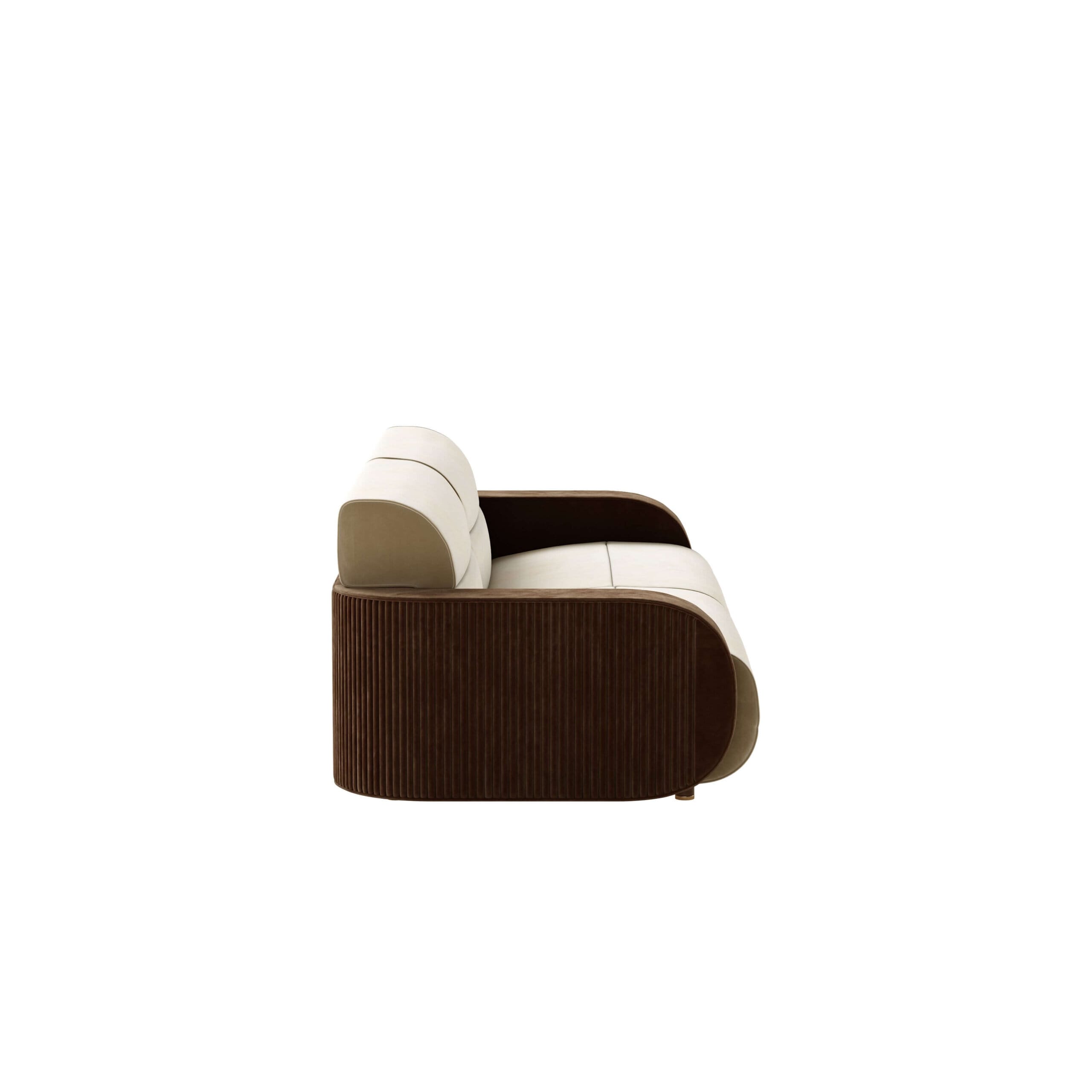 Materiale și finisaje: Lemn de nuc mat, material textil și alamă lustruită