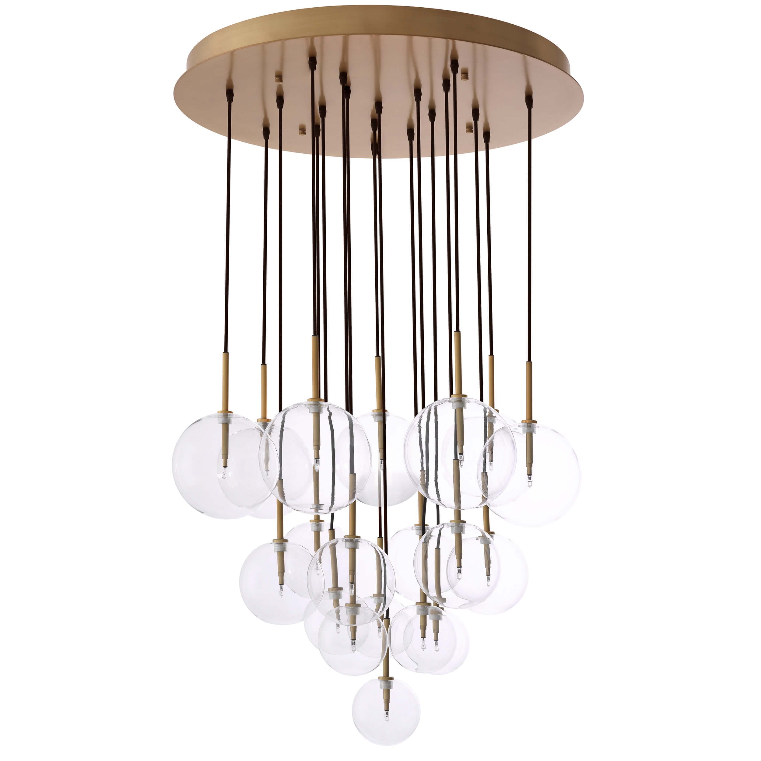 Suspensia pornește dintr-o rozetă circulară cu finisaj din alamă antichizată, de unde coboară 12 sfere din sticlă transparentă, fiecare reglabilă pe înălțime. Acest sistem modular permite aranjarea corpurilor într-o compoziție liberă, adaptată spațiului.Ideal pentru a fi amplasat deasupra unei mese de dining sau a unei mese centrale, pendulul devine cu ușurință un punct focal elegant și dinamic.