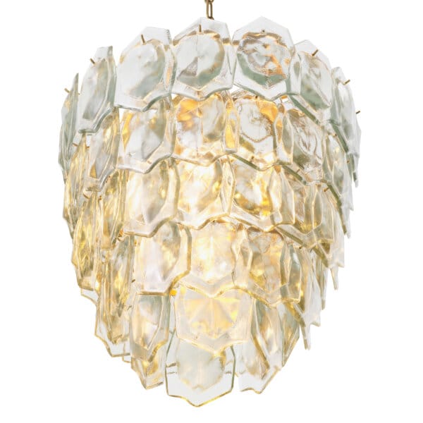 Corpul de iluminat, cu finisaj vintage din alamă, este decorat cu peste 60 de piese de sticlă lucrate manual.