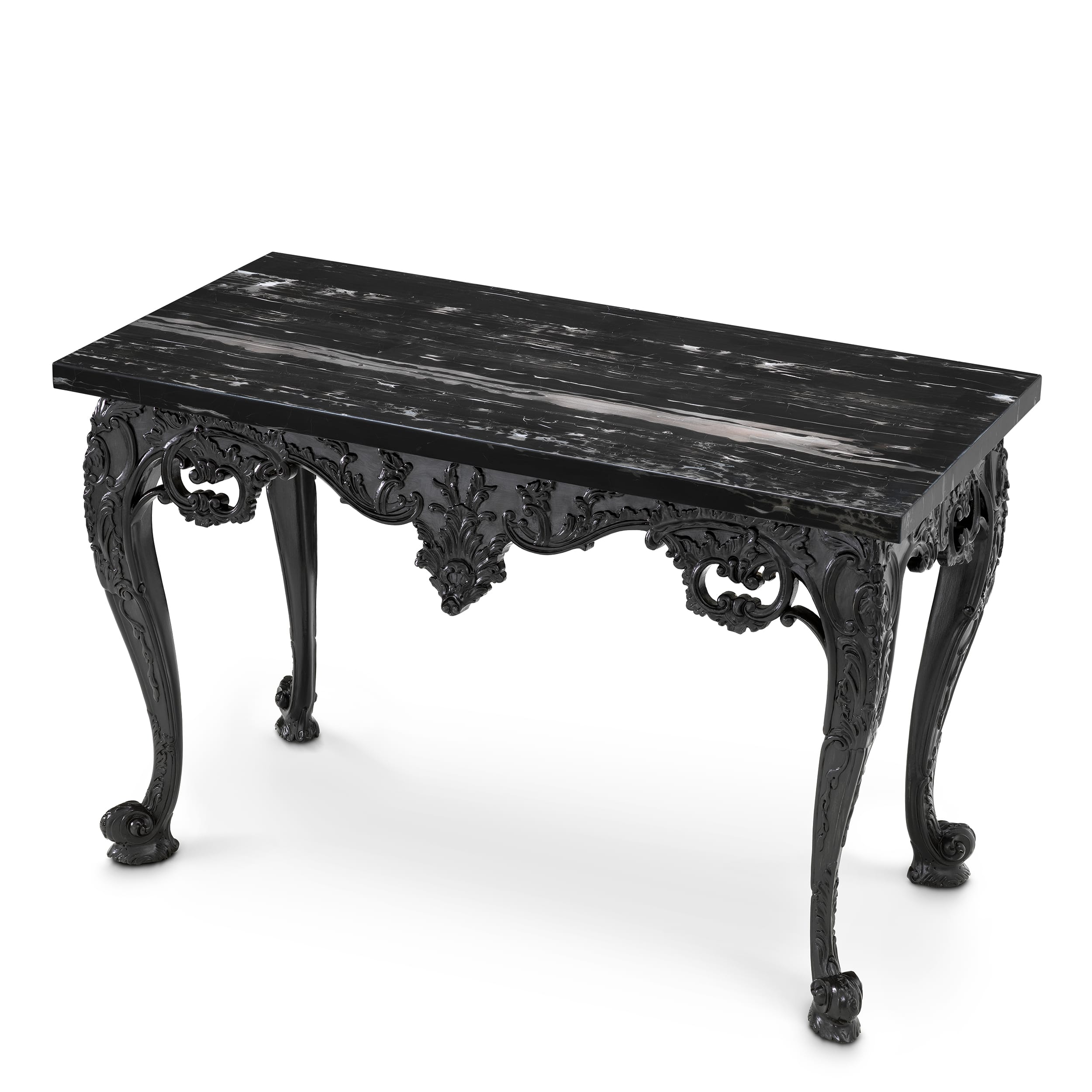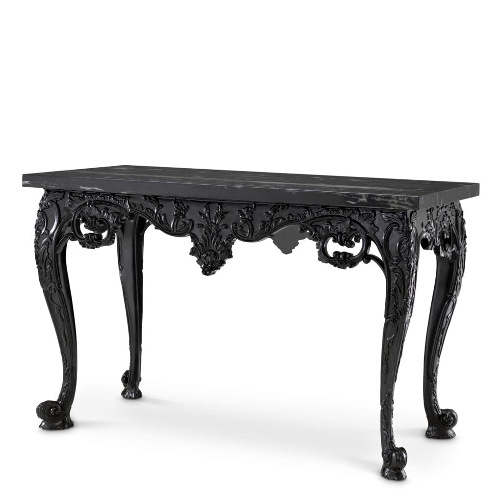 Consola Cadwalader îmbină un blat din marmură neagră cu o bază sculptată din lemn în finisaj închis, conturând o prezență elegantă și bine proporționată. Liniile fluide și silueta echilibrată reflectă măiestria designului inspirat din secolul al XVIII-lea, în timp ce materialele și tonurile profunde îi conferă o expresie contemporană. Prin caracterul său distinct și atemporal, piesa aduce profunzime și rafinament în interior.