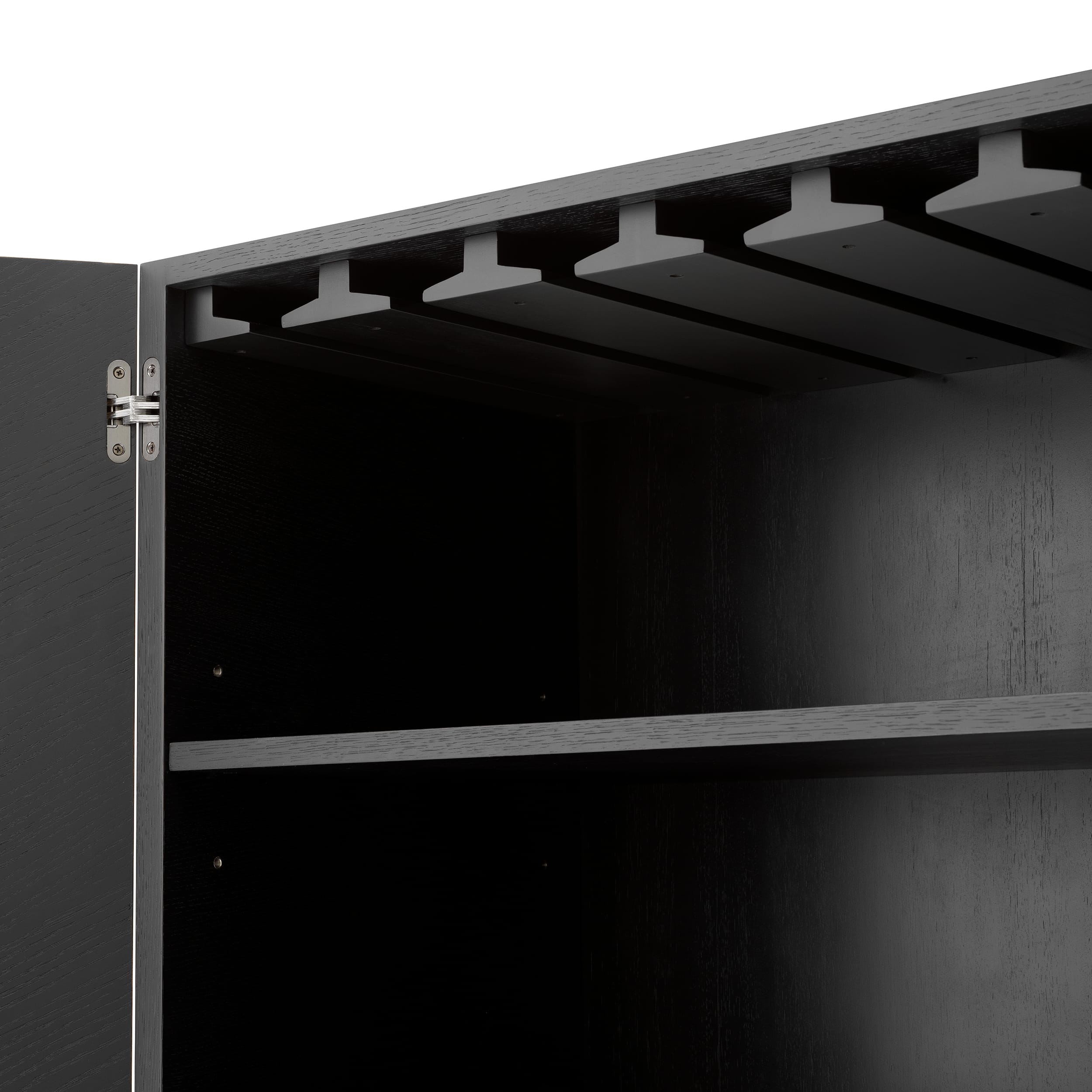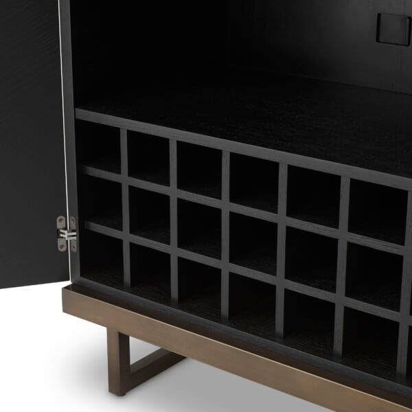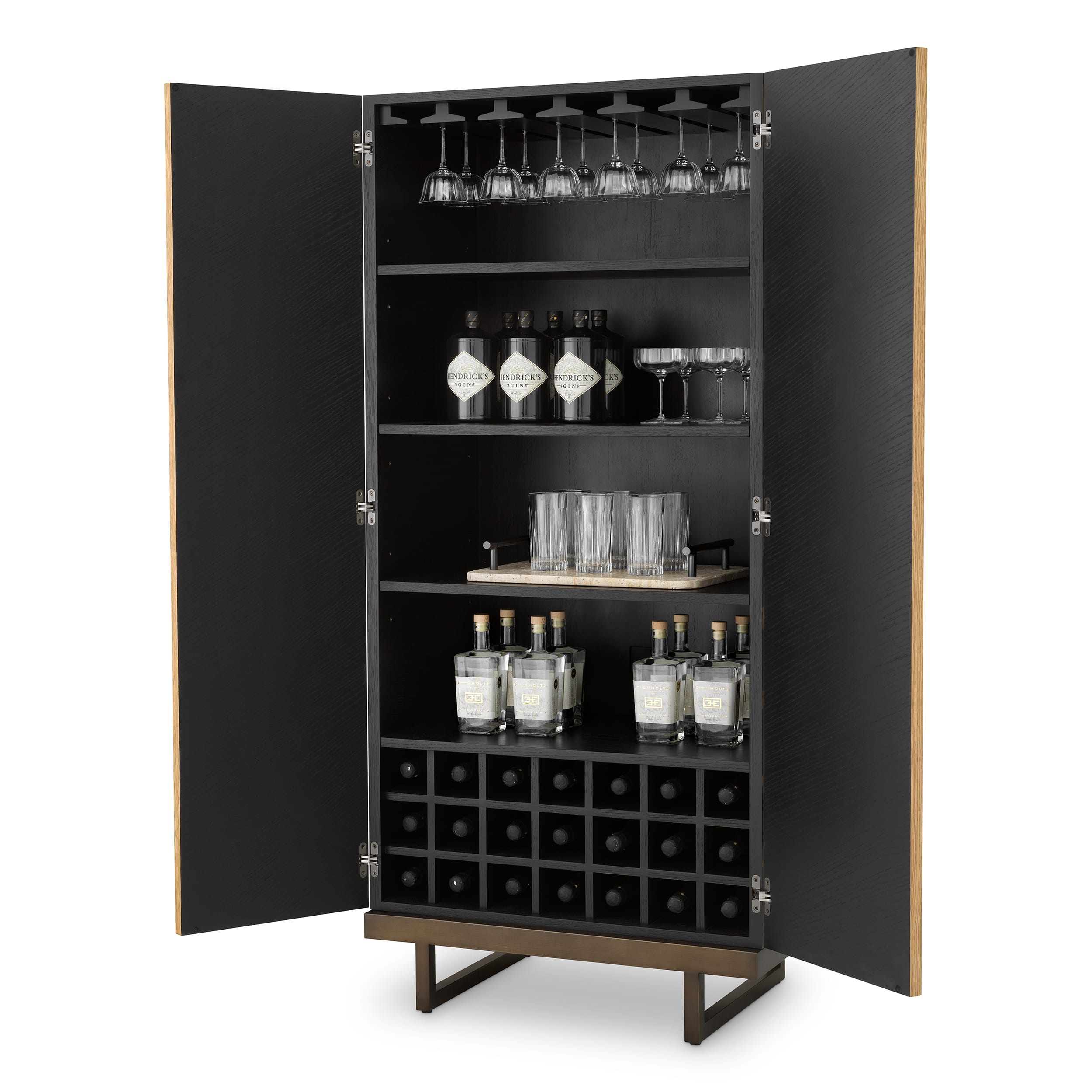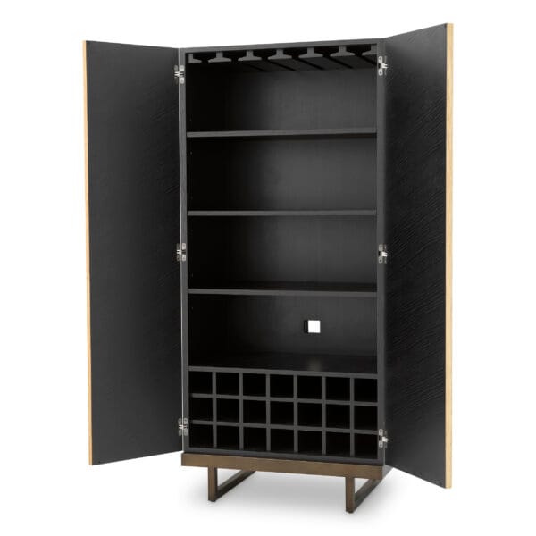 În interior, în spatele ușilor atent conturate, sunt create compartimente dedicate pentru până la 21 de sticle, precum și spații generoase pentru pahare. Suportul suspendat și rafturile bine proporționate completează designul printr-o funcționalitate gândită pentru seri de socializare, servire și organizare ușoară.