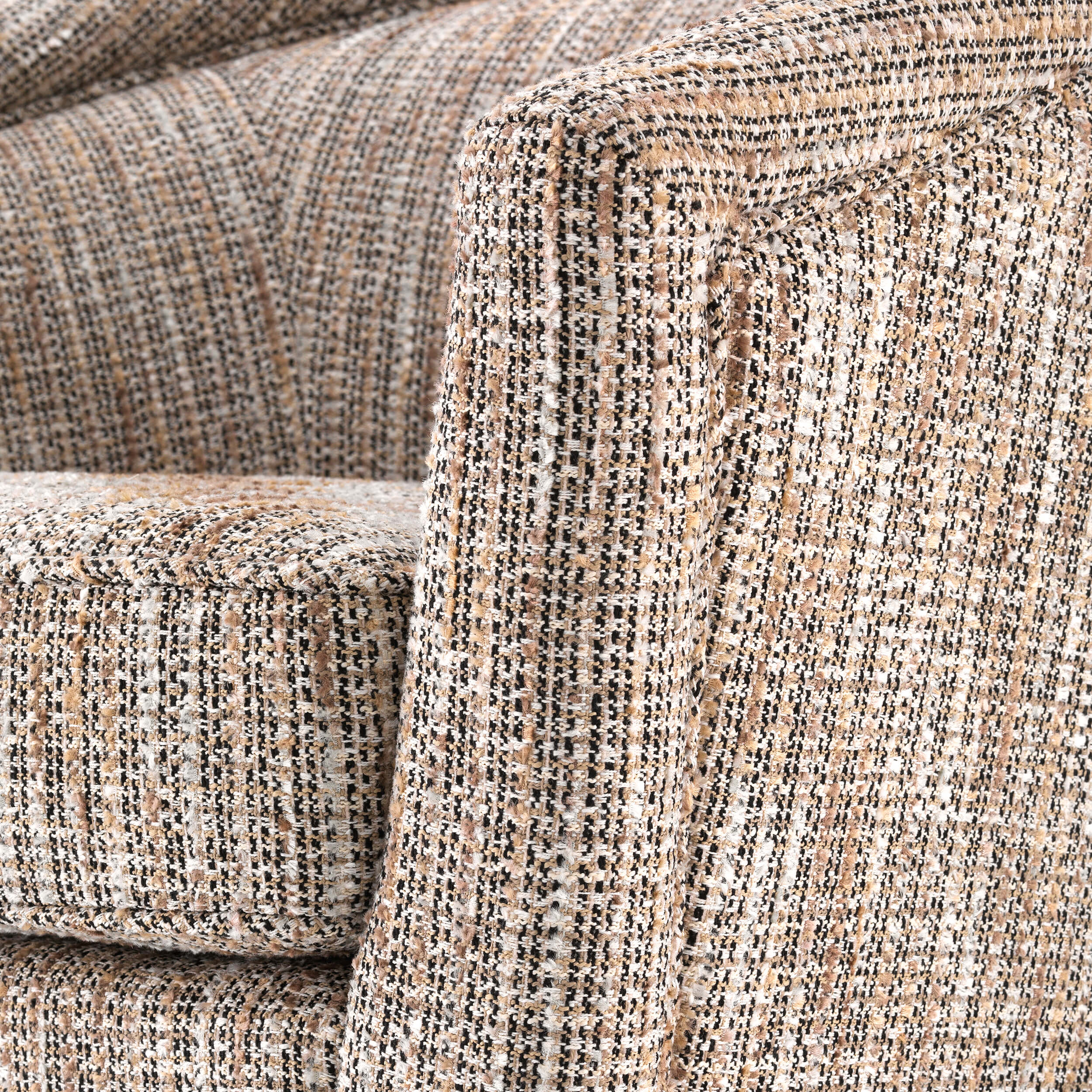 Un design contemporan, cu accente retro, caracterizează acest fotoliu tip butoi, susținut de o bază pivotantă cu finisaj auriu mat, pentru un plus de modernitate. Tapițeria Mademoiselle beige conferă piesei un aspect luxos și sofisticat.