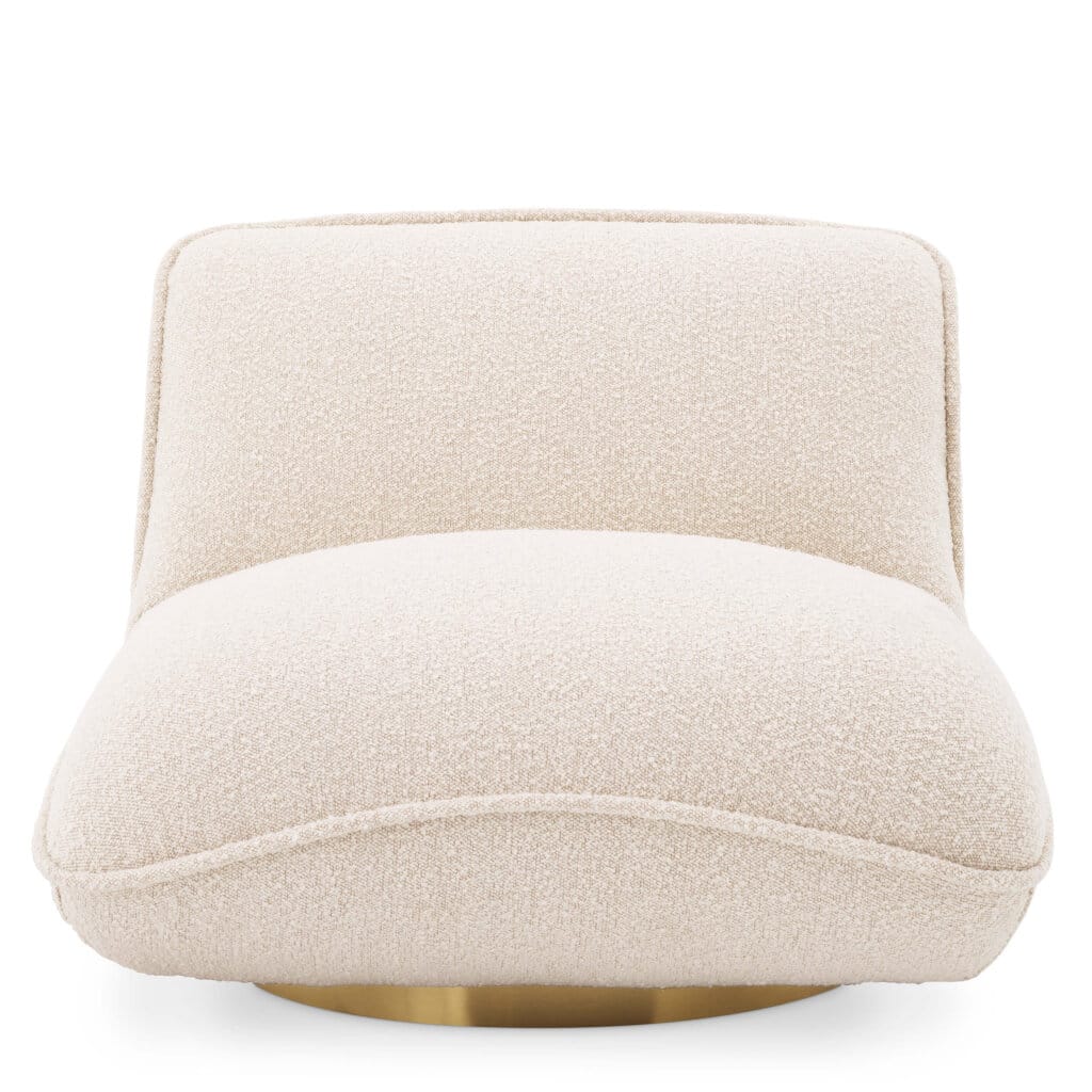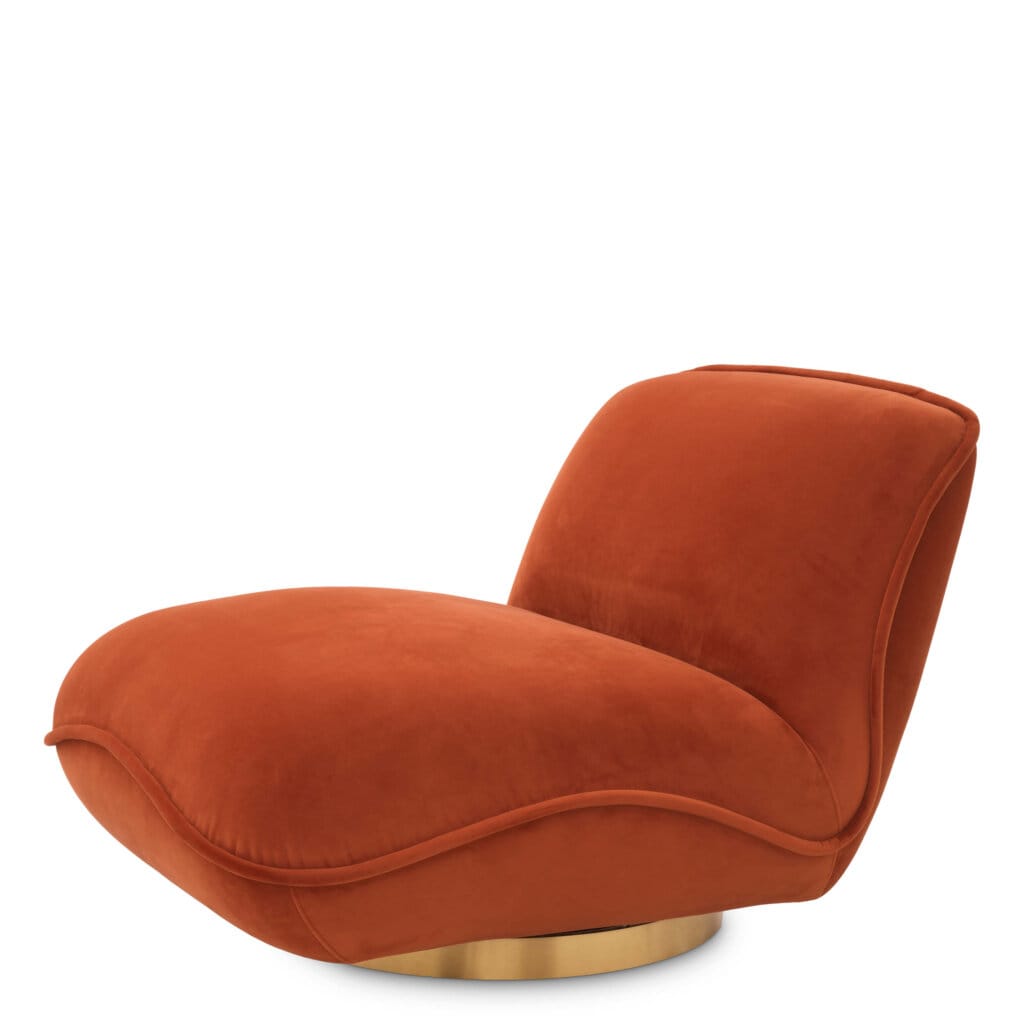 Având forma a două perne așezate în unghi drept, acest scaun pivotant este nu doar estetic plăcut, ci și foarte confortabil. Este disponibil cu tapițerie din catifea portocalie Savona sau bouclé crem, ambele cu margini pipăite, fiind susținut de o bază pivotantă cu finisaj din alamă periată. Indiferent de varianta aleasă, fotoliul devine piesa centrală a oricărui living, combinând eleganța cu funcționalitatea.