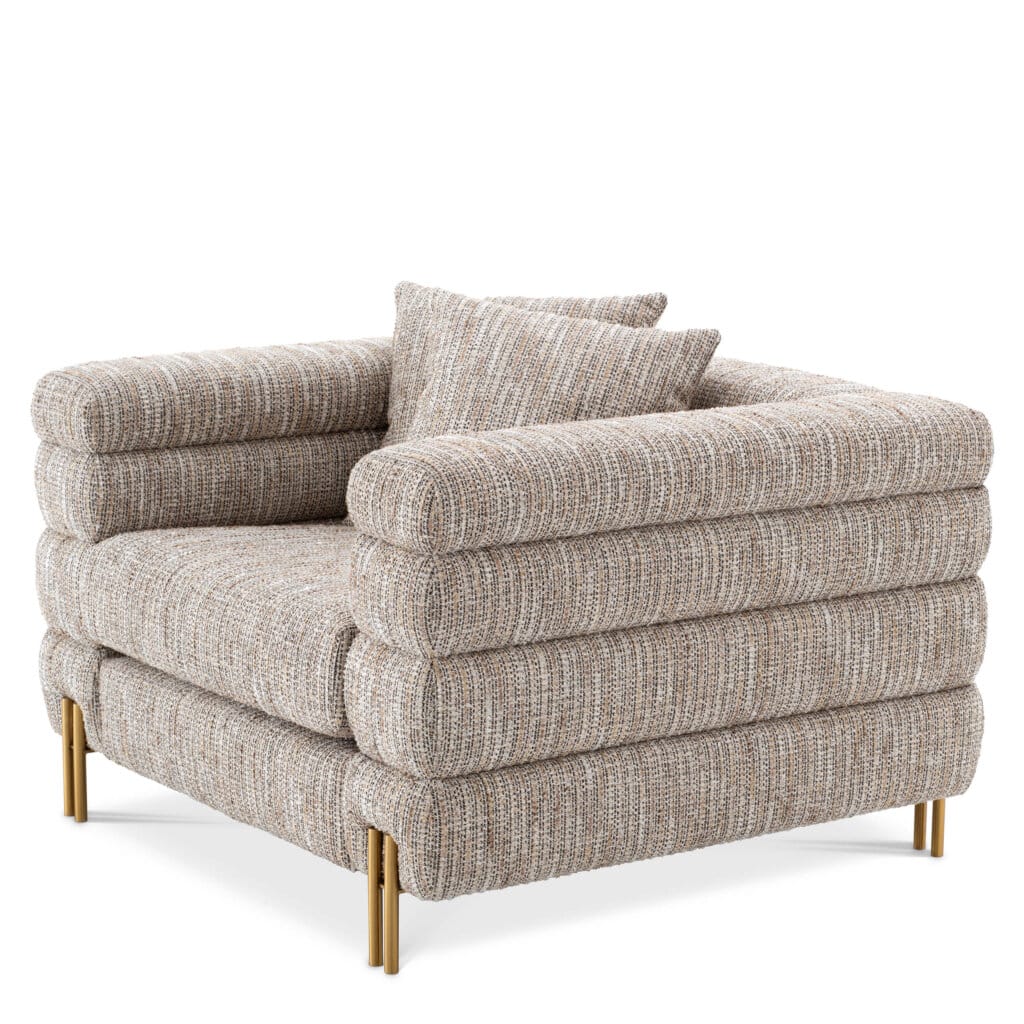 Silueta distinctivă a acestui scaun este inspirată de stilul Streamline Moderne, o interpretare Art Deco a anilor 1930, definită prin forme curbe și linii orizontale elegante. Pentru un plus de confort și rafinament, fotoliul este completat de două perne decorative pătrate.
