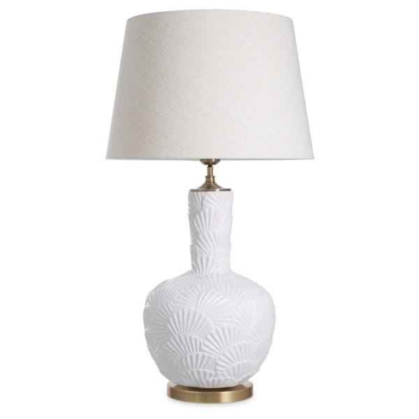 Această lampă marca Eichholtz este realizată din ceramică de culoare albă și include un abajur cu aspect de in, fabricat din fire reciclate. Baza elegantă prezintă un model inspirat de scoici și are un finisaj vintage din alamă antichizată. Perfectă pentru spații de locuit rafinate. Lampa adaugă o notă unică de artă și stil desăvârșit, fiind un adevărat simbol al luxului și sofisticării.