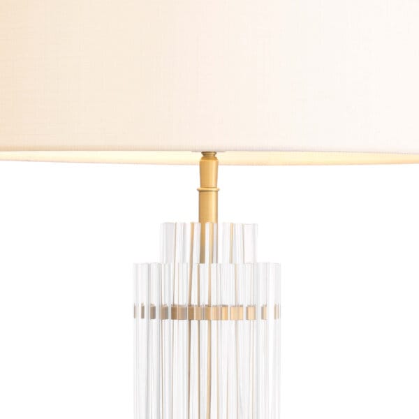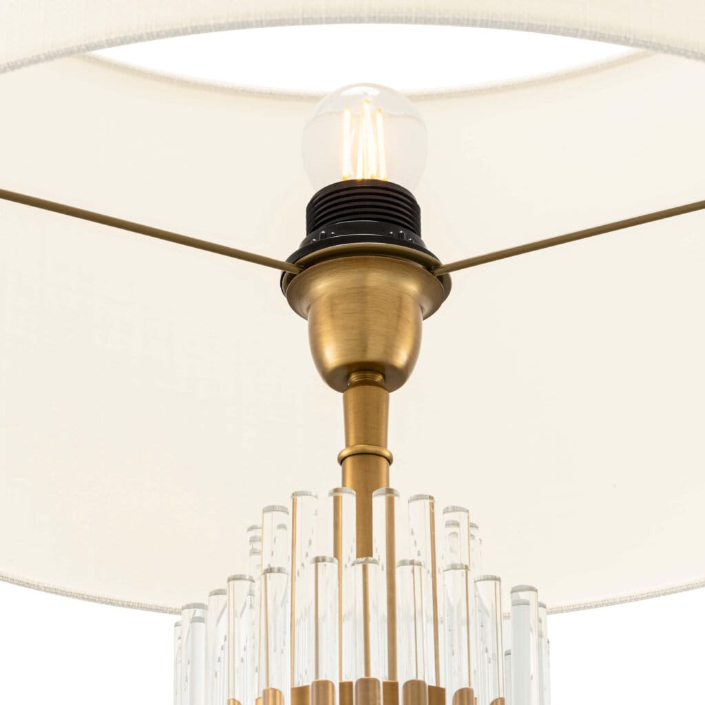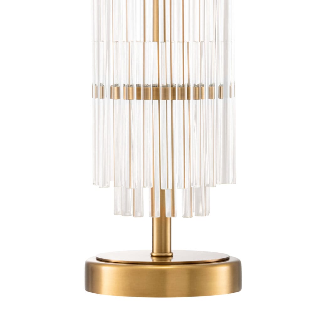 Baza din sticlă transparentă și finisajul din alamă antichizată oferă un farmec clasic și sofisticat. Abajurul inclus completează designul armonios, iar lumina difuză creează o atmosferă caldă și relaxantă în orice încăpere.