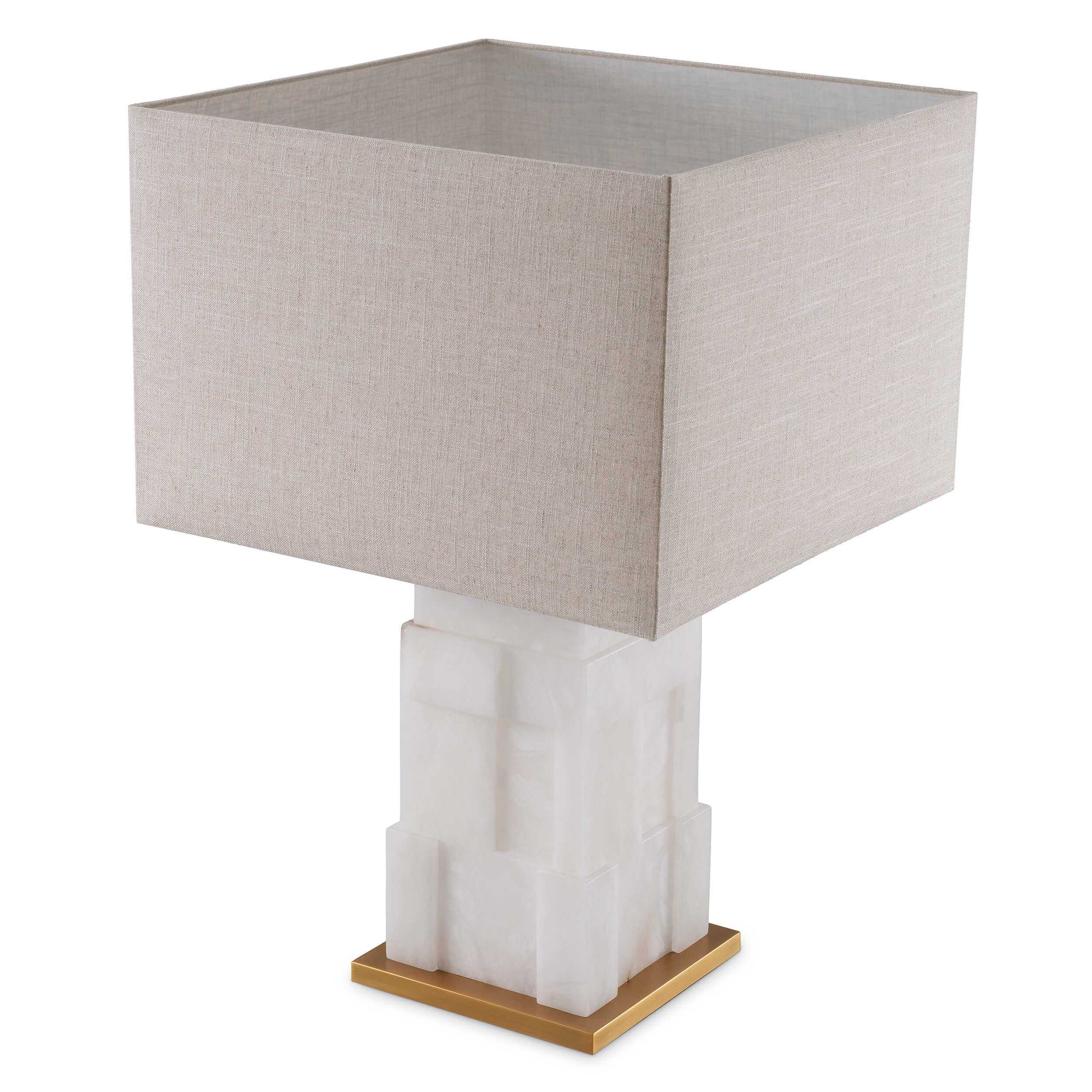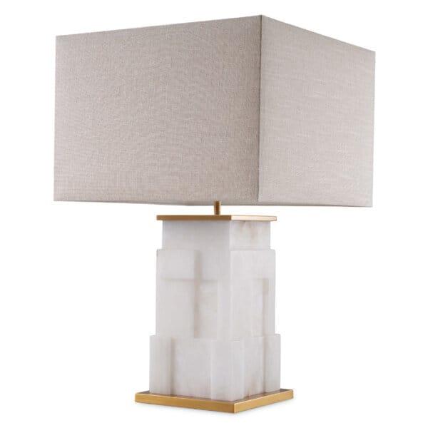 Baza luminoasă din alabastru natural, cu opțiune de iluminare internă, emană căldură, fiind completată de un abajur textil din amestec de in, ales pentru textura sa subtilă și lumina difuză pe care o oferă.