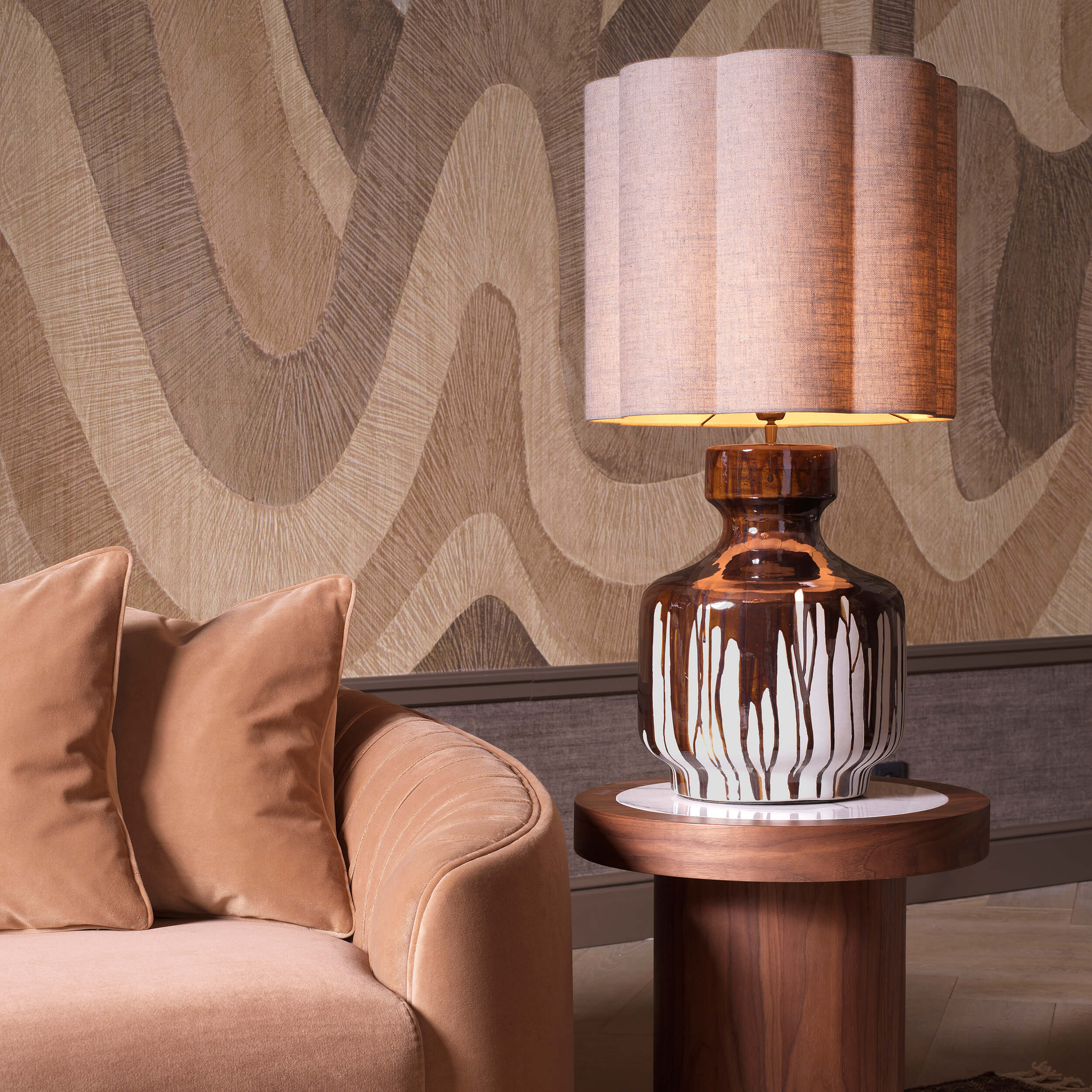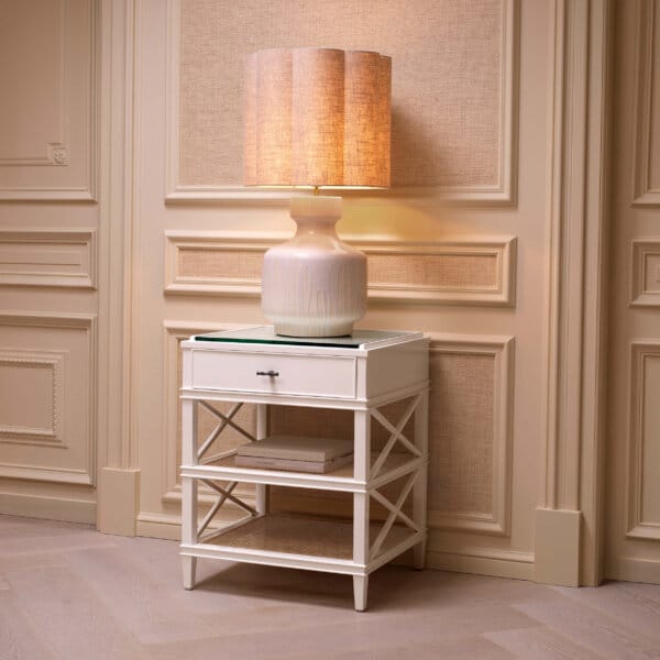 Abajurul din amestec de in, perfect structurat, adaugă textură și echilibru, în timp ce accentele din alamă cu finisaj vintage completează compoziția cu o notă subtilă de eleganță.