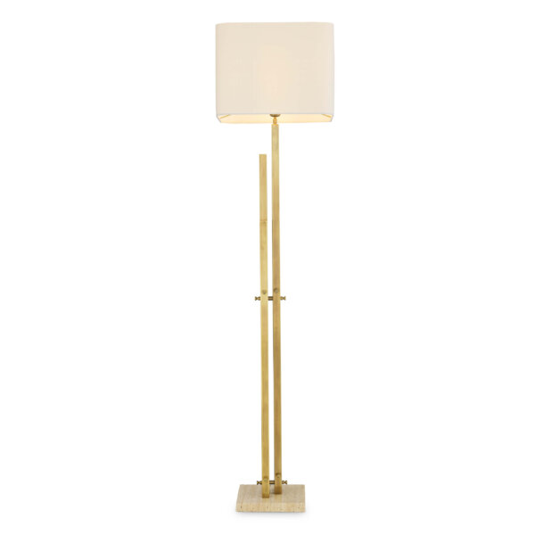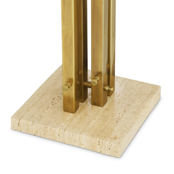 Această piesă stilată are o bază realizată din travertin, o piatră naturală unică, durabilă și estetic plăcută. Partea superioară a bazei prezintă un design aparte și finisaj vintage din alamă, combinând perfect tradiția cu modernismul pentru o piesă atemporală.