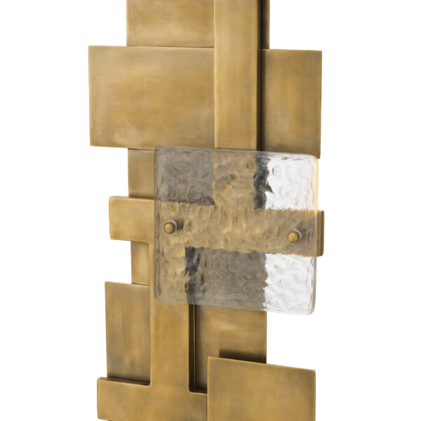 Cu un finisaj din alamă vintage și elemente din sticlă transparentă, acest corp de iluminat emană un farmec atemporal ce se integrează armonios în decoruri clasice sau contemporane.