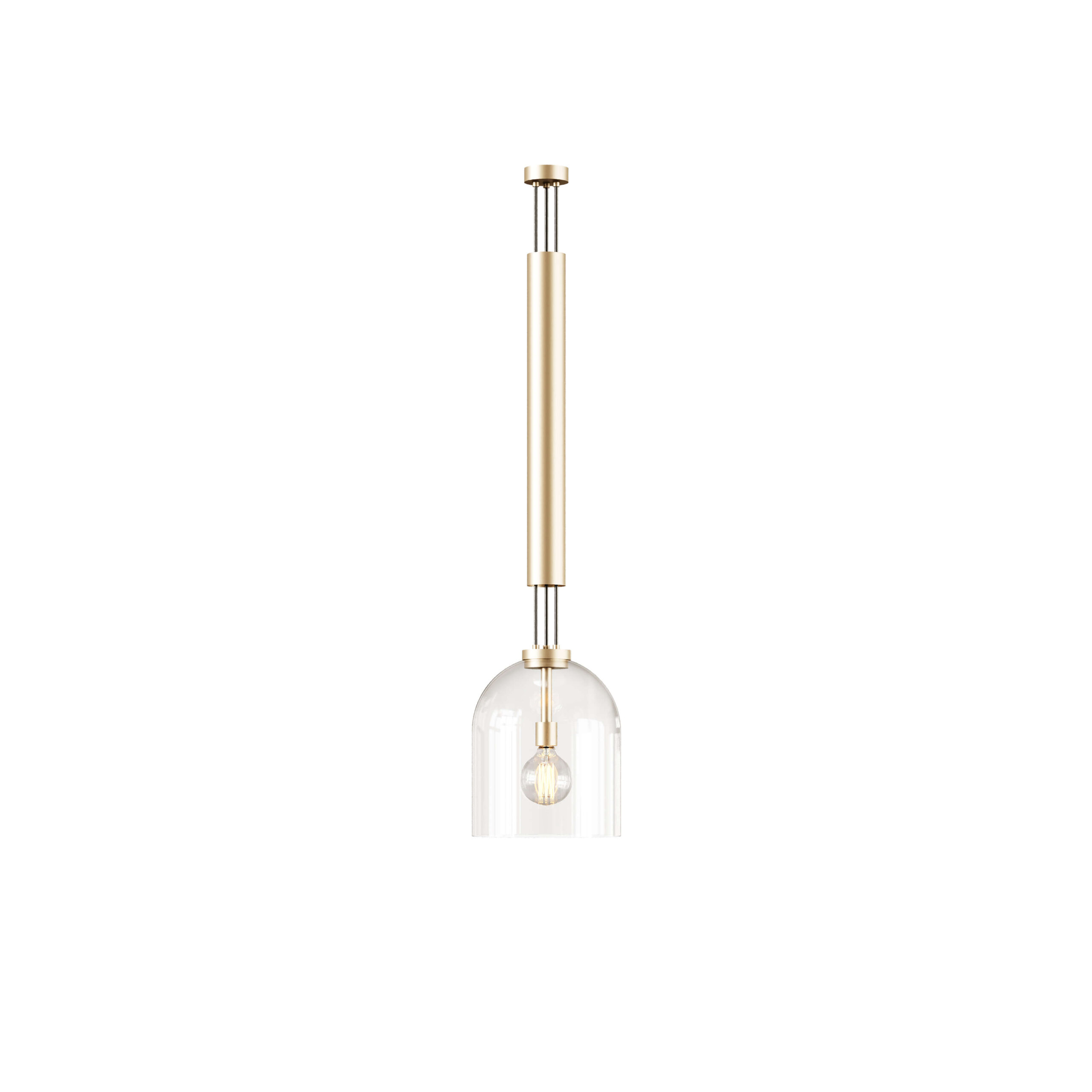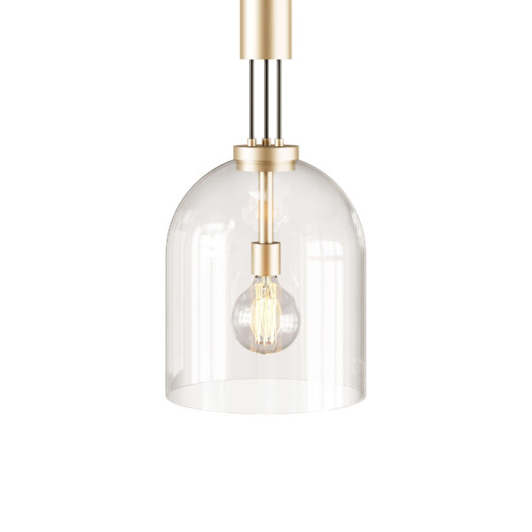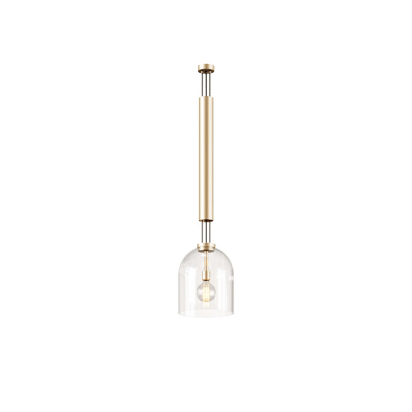 Lustra Moore reflectă eleganța stilului mid-century, printr-o armonie între finisajele metalice lustruite și elementele delicate din sticlă. Structura cilindrică din alamă placată cu aur coboară elegant, susținând o cupolă transparentă din sticlă care învăluie sursa de lumină și creează o strălucire caldă și primitoare. Combinația dintre metalul lucios și sticla curbată accentuează estetica sofisticată a lustrei, transformând-o într-o piesă atemporală, potrivită pentru orice interior.