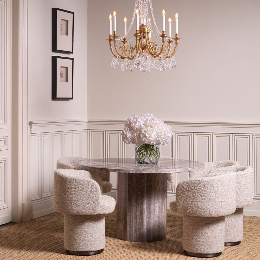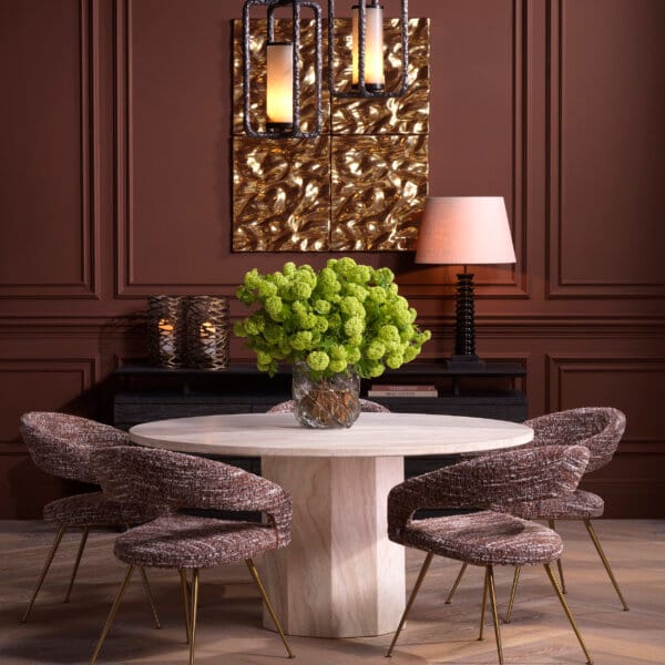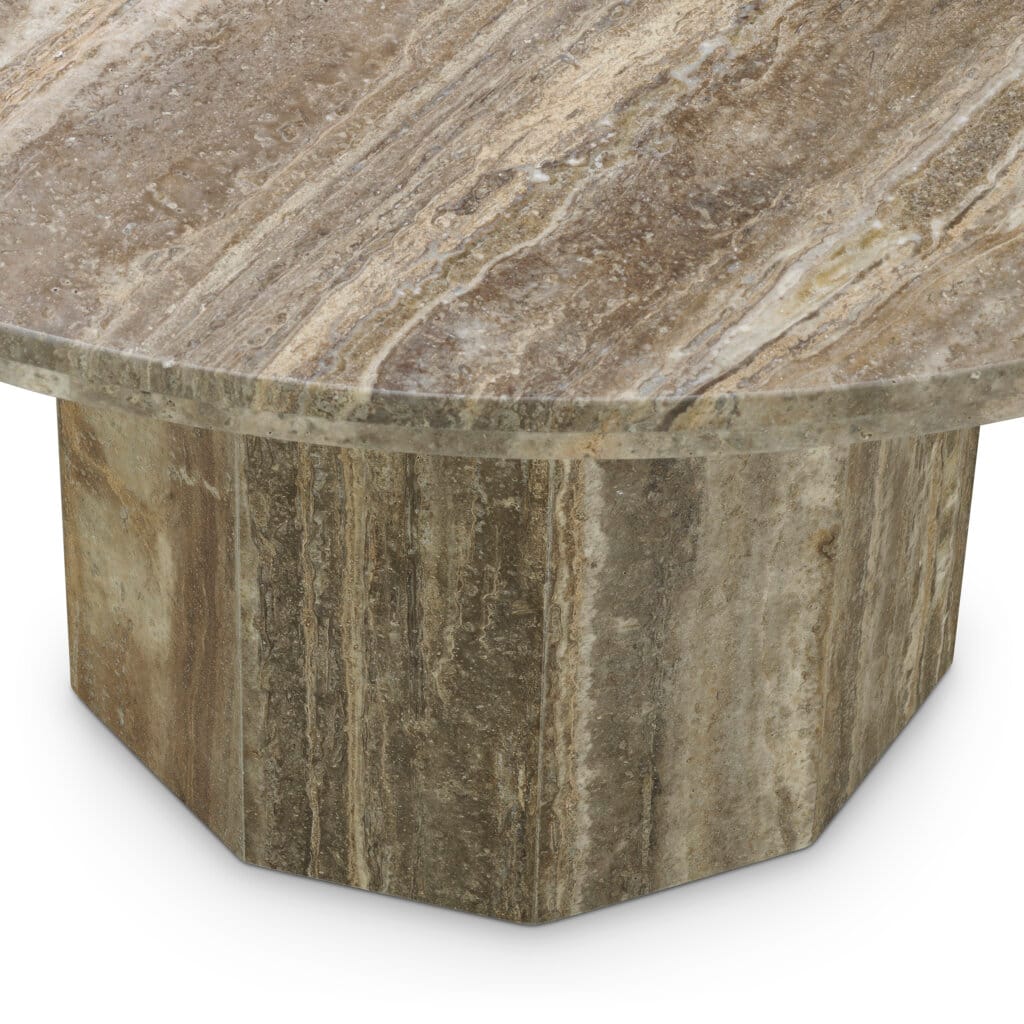 Această masă pune în valoare frumusețea travertinului natural, fiecare piesă evidențiindu-se prin variații unice de culoare și textură. Designul său aduce un ecou al esteticii medievale, creând un echilibru armonios între naturalețe și rafinament în spațiul de dining.