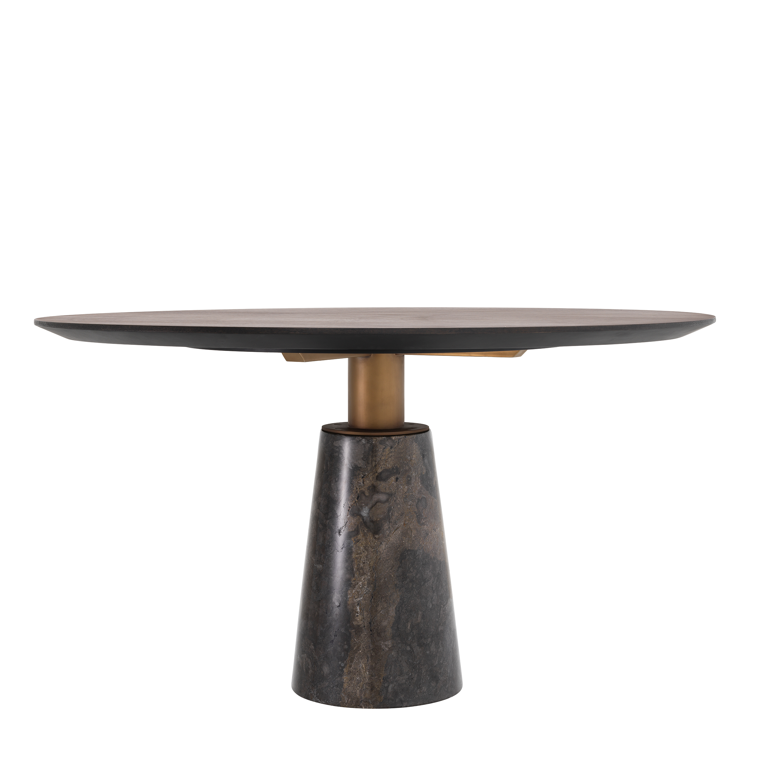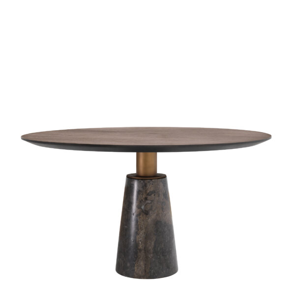 Blatul rotund este finisat cu furnir de stejar în nuanță de mocha, cu fibră dreaptă, iar baza este realizată din marmură gri, formând o combinație ușor de integrat în decorul existent. Designul rotund și materialele naturale, o fac potrivită pentru un ambient confortabil, dedicat momentelor de socializare.