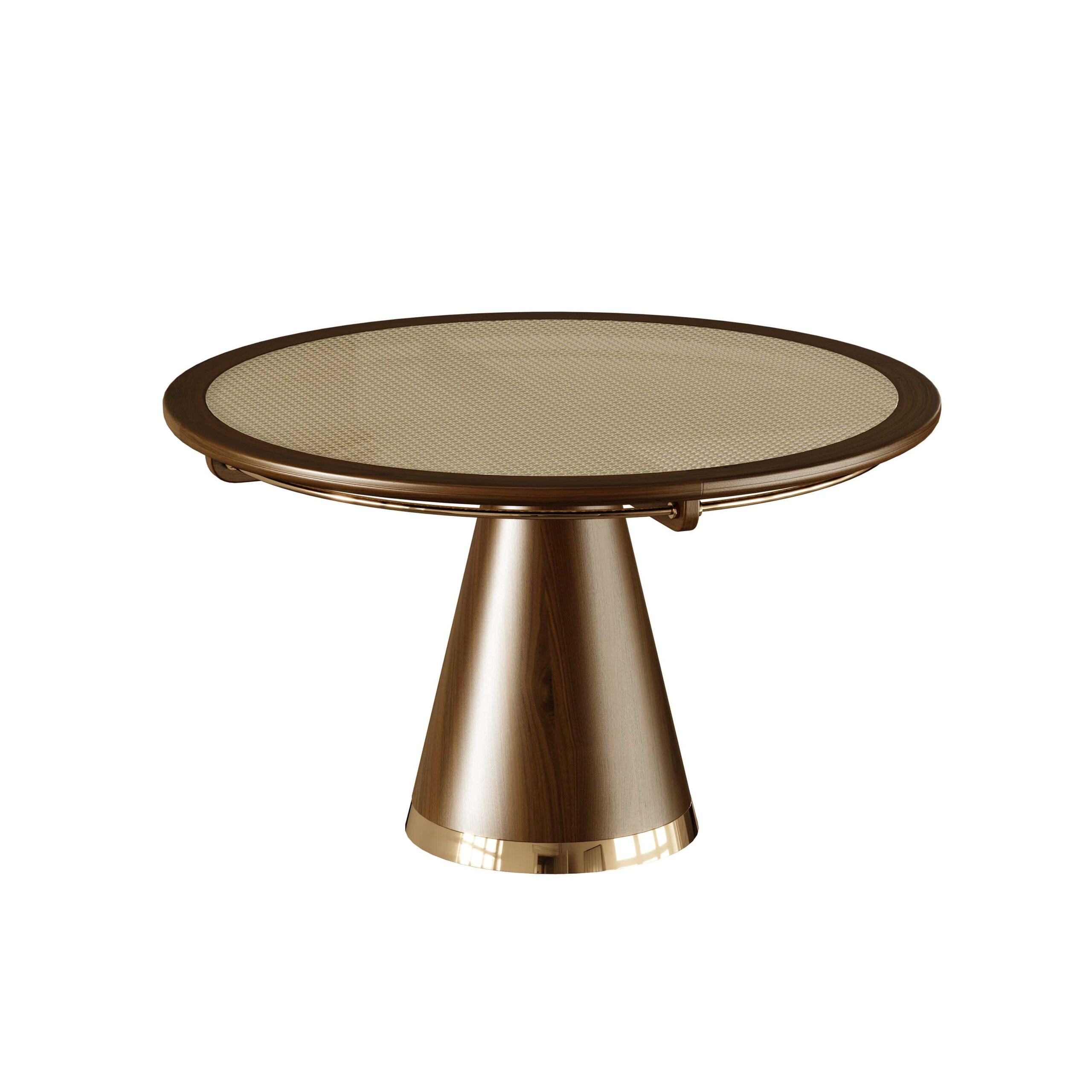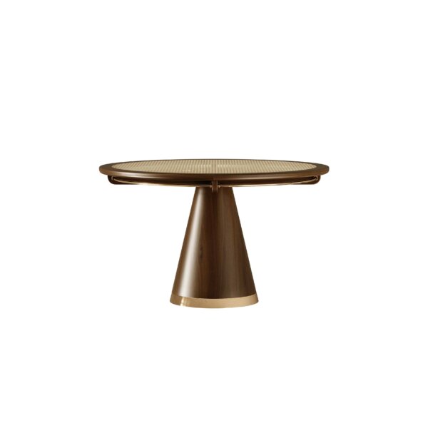 Masa de dining Holiday aduce în prim-plan una dintre tendințele actuale în designul interior – ratanul – transformându-l în elementul central al piesei. Fibra naturală, amplasată în mijlocul mesei și protejată de un robust blat circular din sticlă, contrastează armonios cu materialele nobile, creând un design elegant și sofisticat, ce oferă o atmosferă caldă și primitoare.
