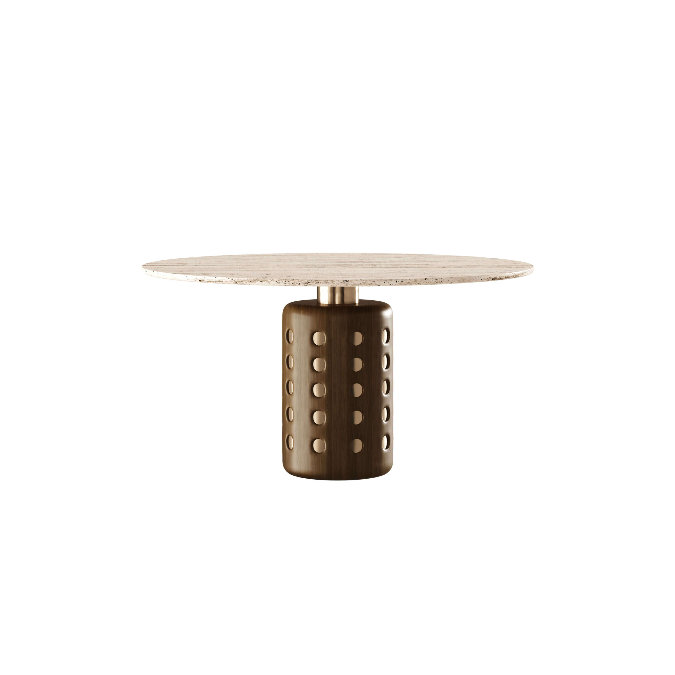 Materiale și finisaje: Lemn de nuc mat, alamă placată cu aur și marmură Travertino