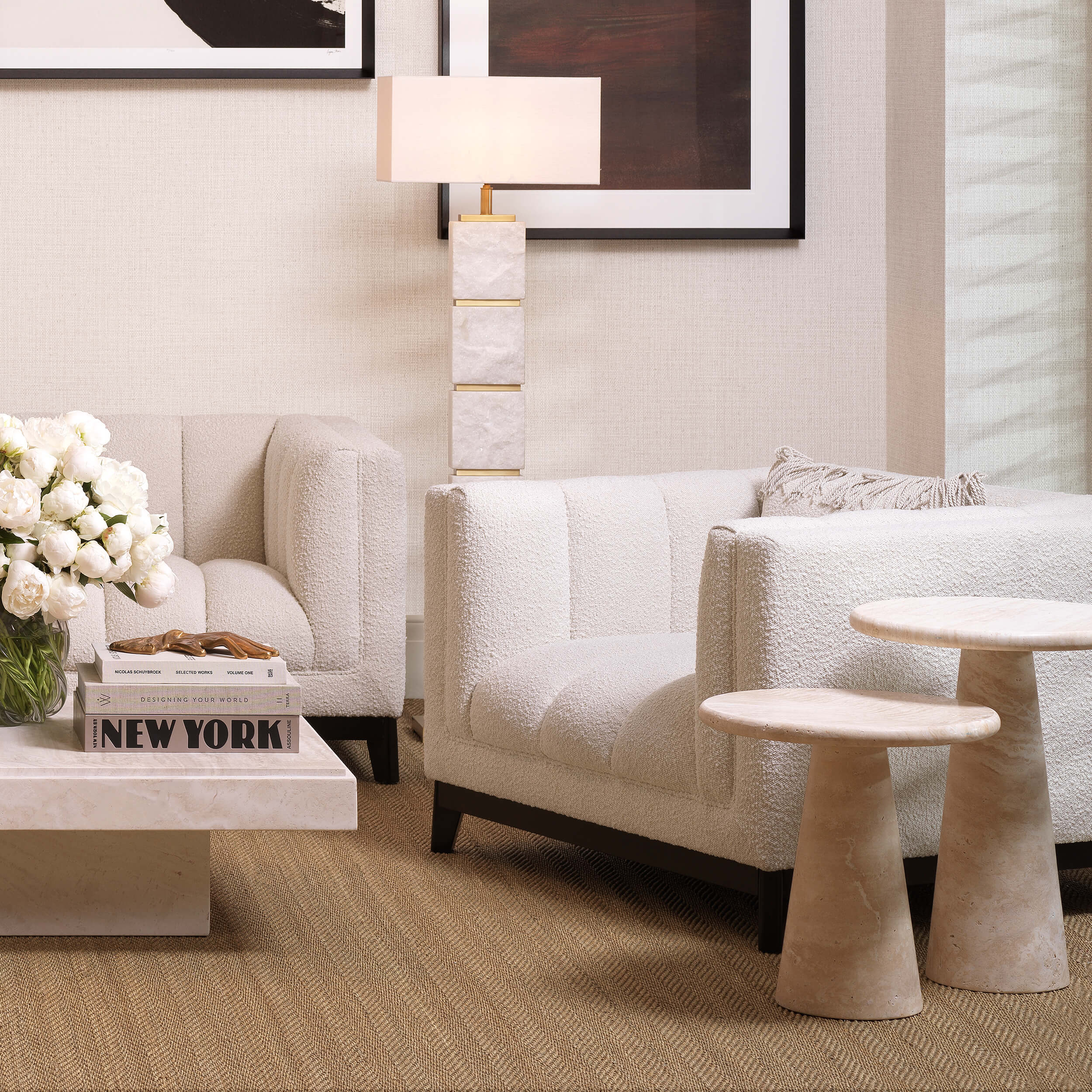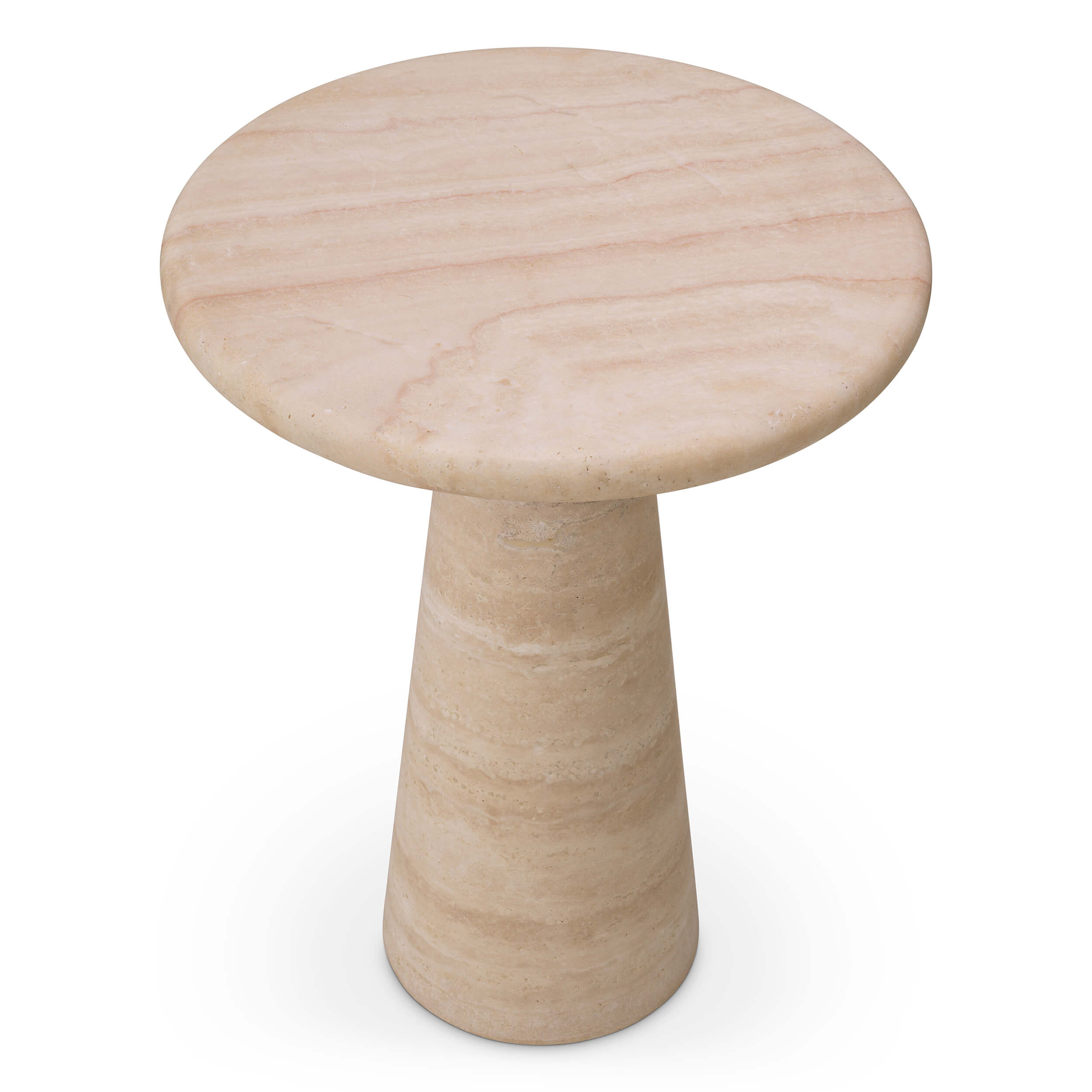 Realizată din travertin, o piatră calcaroasă cu texturi naturale unice, această piesă sculpturală are un blat rotund sprijinit pe o bază conică. Liniile sale curbe frumoase ridică estetica oricărui spațiu, iar cele două variante de mărime pot fi combinate pentru a adăuga profunzime și dimensiune decorului.