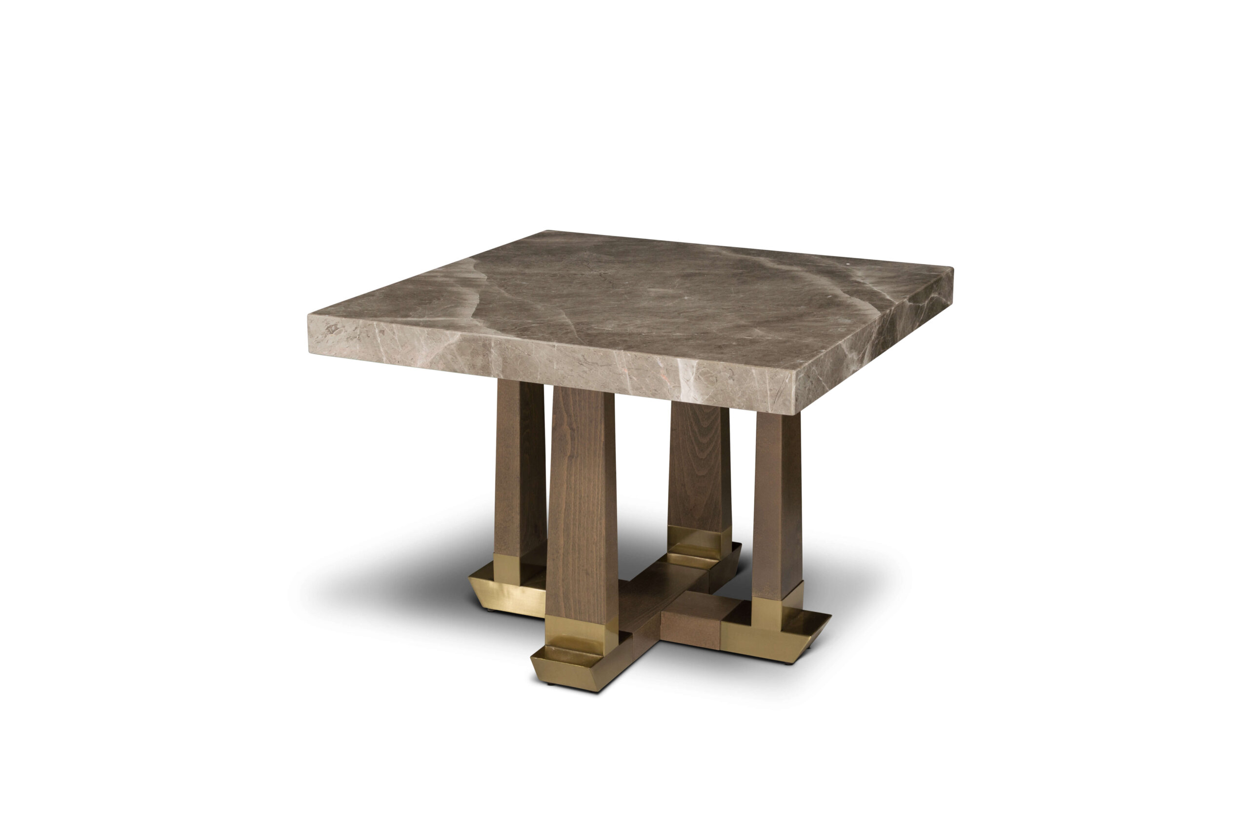 Părțile din lemn sunt confecționate din fag masiv lăcuit, disponibil în multiple variante de culoare. Picioarele metalice, disponibile în finisaj oțel lustruit sau alamă satinat, adaugă lejeritate și un aer distinct întregului ansamblu.