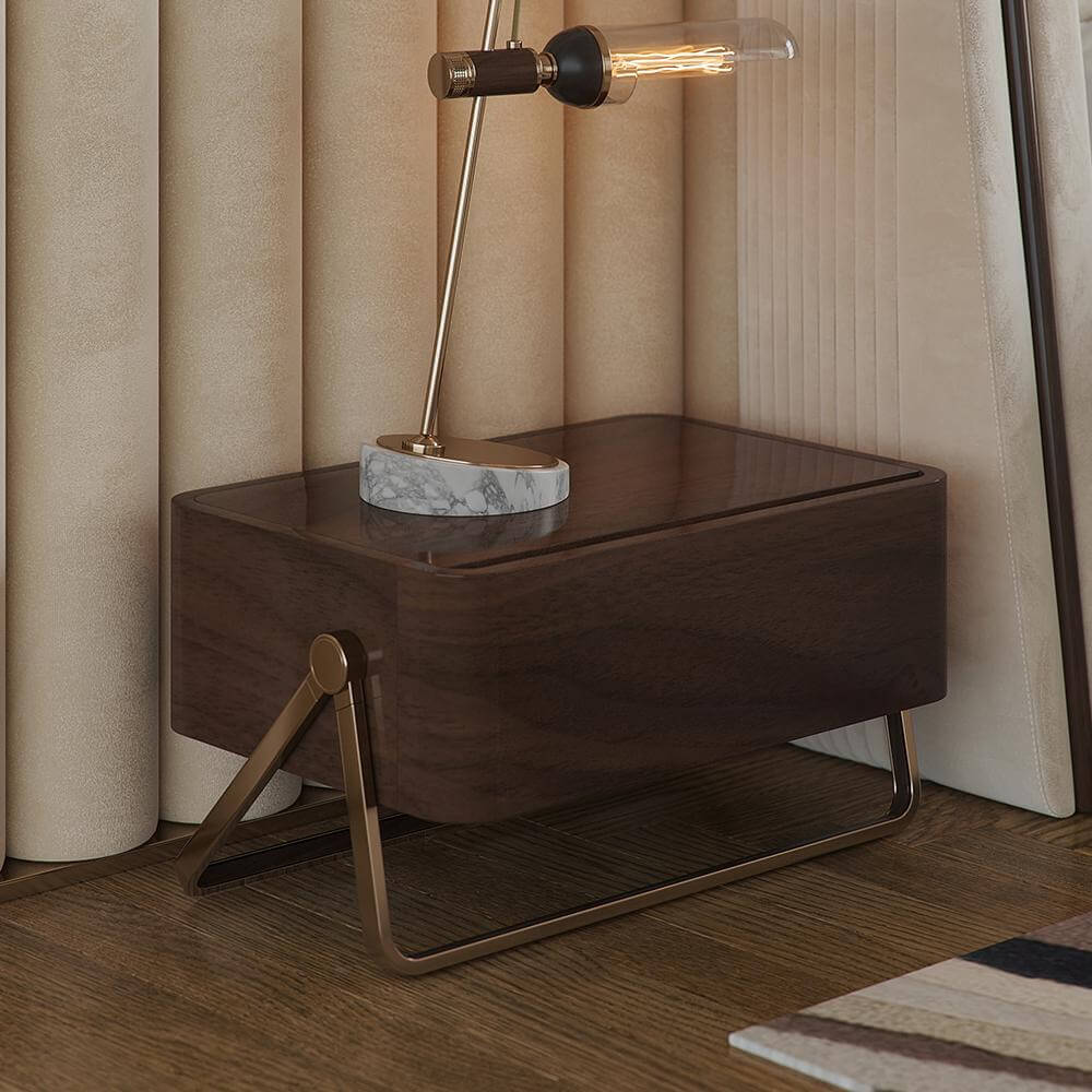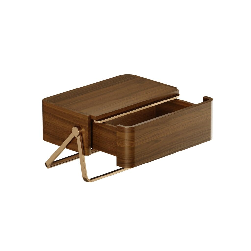 Materiale și finisaje: lemn de nuc mat și alamă lustruită