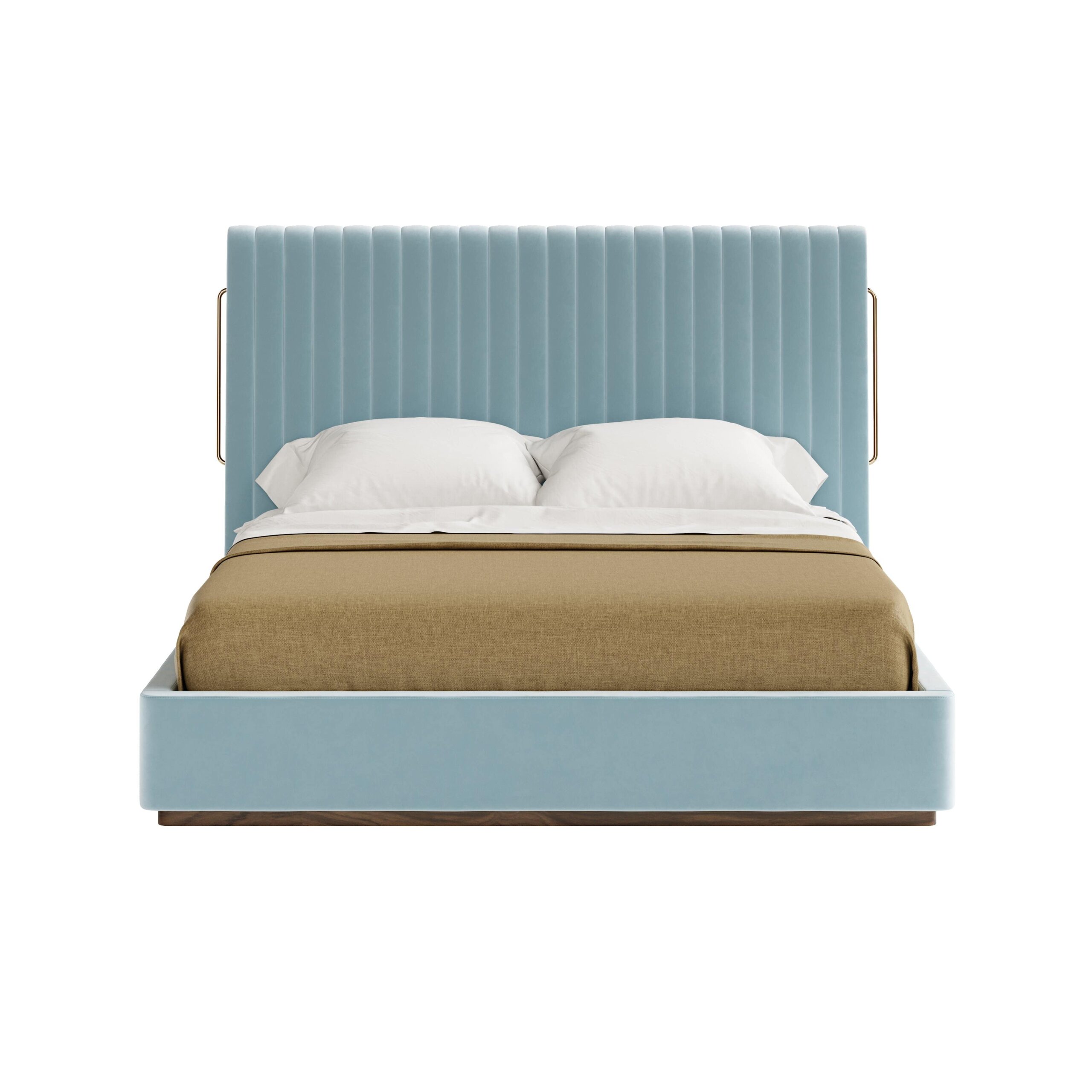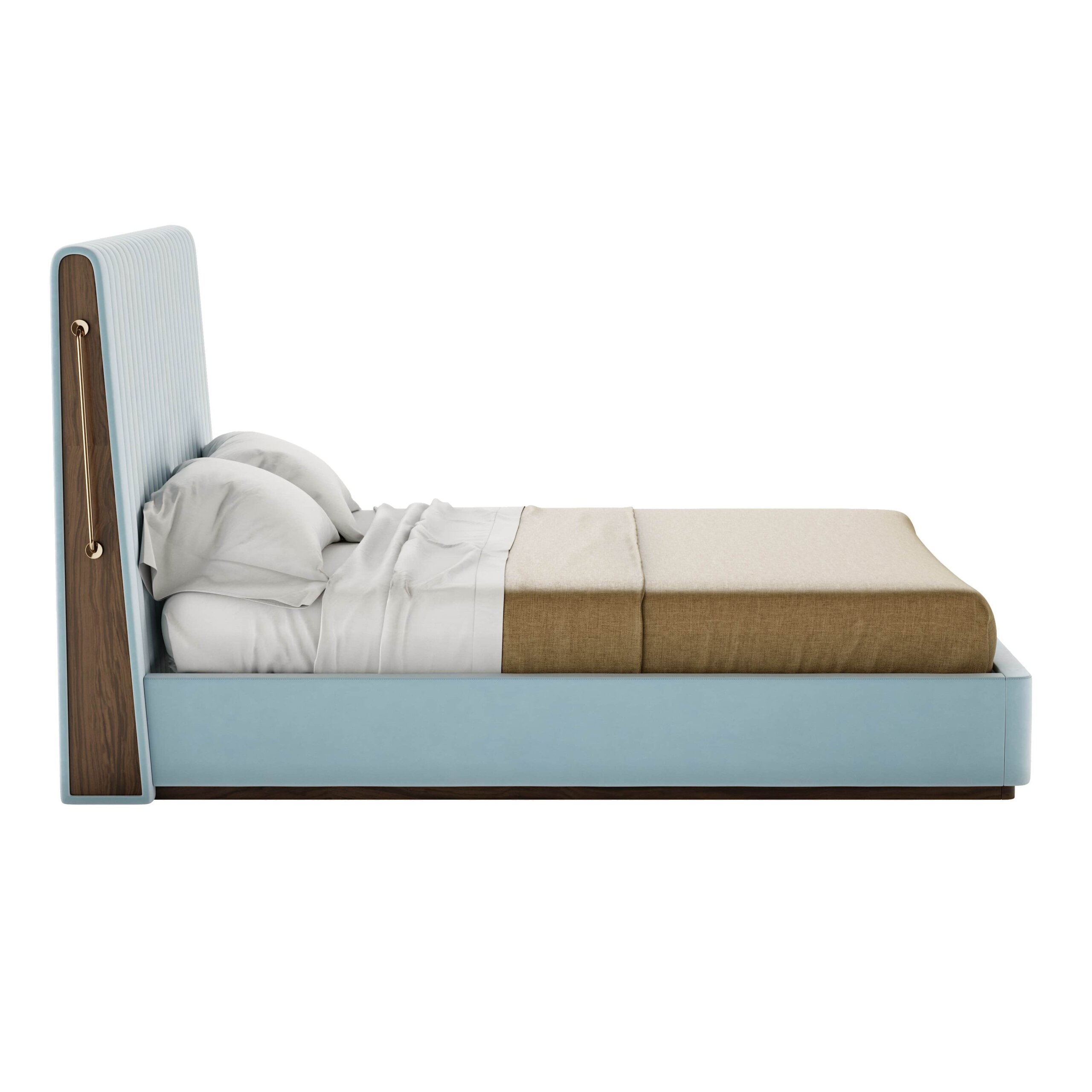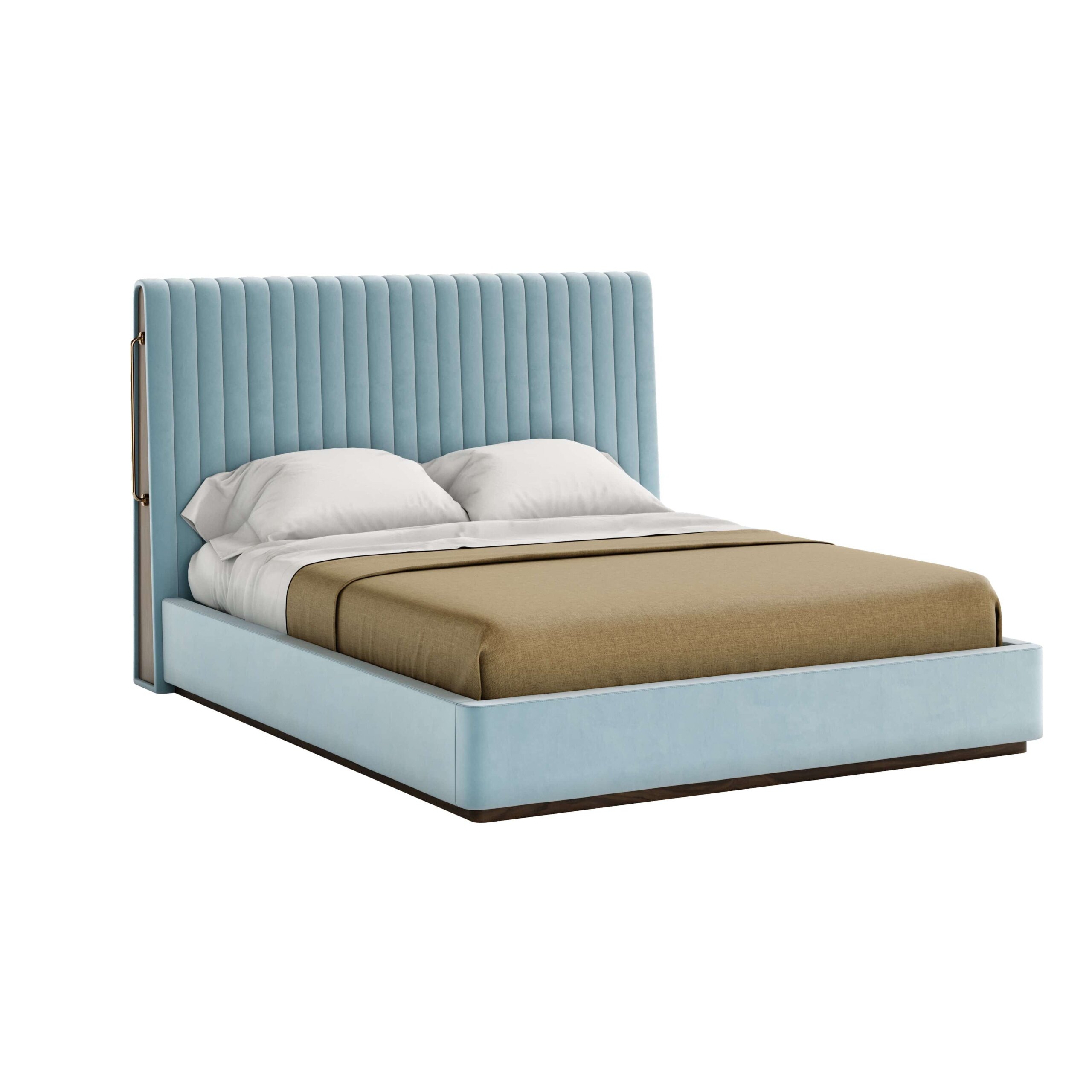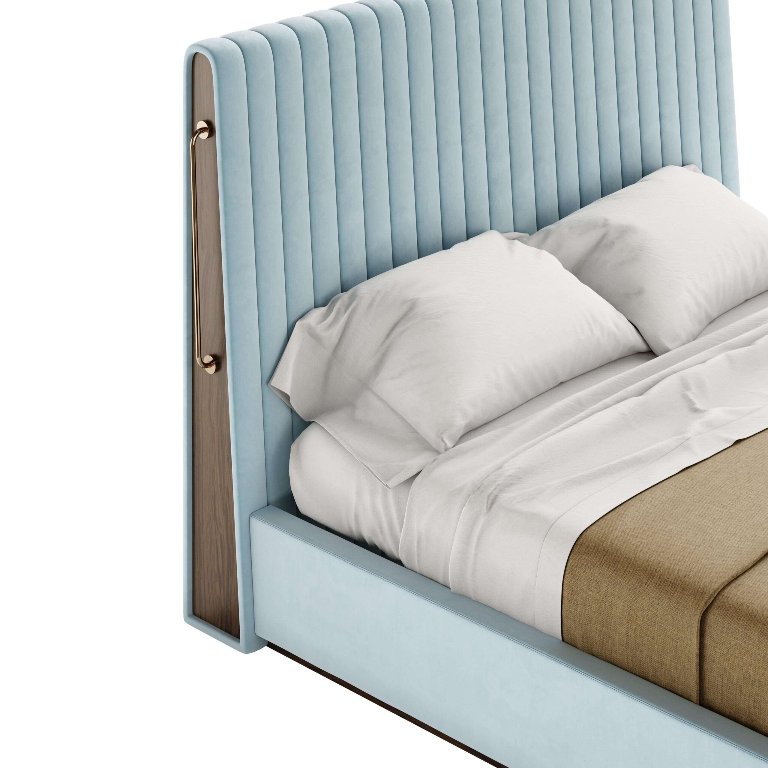Patul Rivers impresionează printr-un design echilibrat, care îmbină simplitatea liniilor verticale cu detalii îndrăznețe. Silueta sa fluidă este completată de o tăblie generoasă, cu o formă neregulată și sculpturală, accentuată de elemente din alamă lustruită. Rezultatul este o piesă cu un stil distinct, care adaugă personalitate oricărui dormitor.