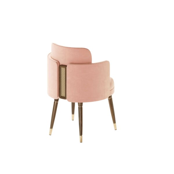 Scaunul de dining Bond aduce o notă contemporană și stilizată în orice zonă de luat masa. Elementul central al designului său este spătarul, unde combinația de materiale creează un efect vizual remarcabil. Două straturi suprapuse, de dimensiuni și forme diferite, conturează structura principală, completată de un detaliu vertical elegant din ratan și încadrată de lemn de nuc mat. Rezultatul este o piesă cu personalitate, ce îmbină îndrăzneala cu rafinamentul.