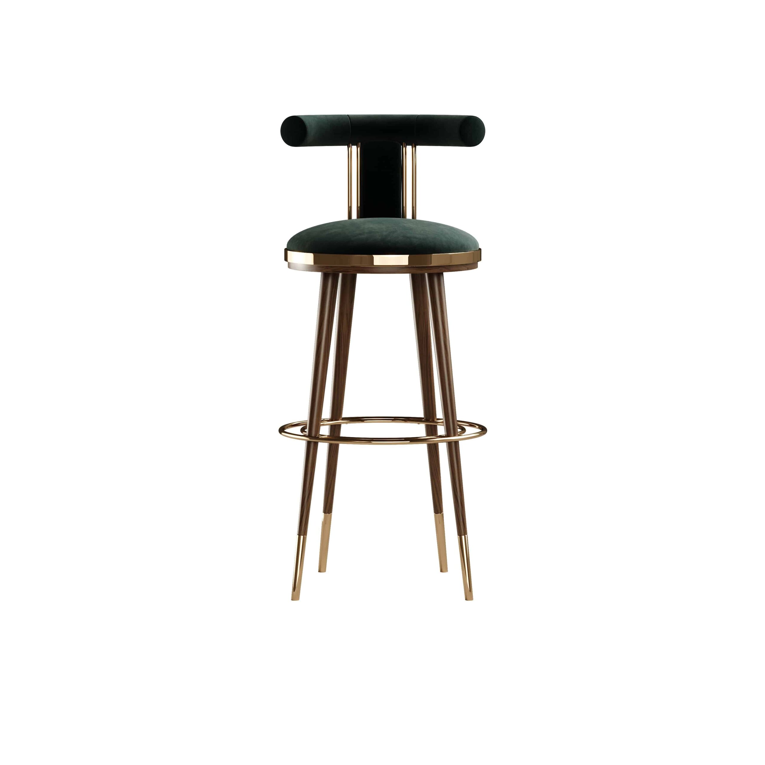 Scaunul de bar Moris impresionează prin forma sa sculpturală, susținută de picioare înalte, conice, realizate din lemn de nuc lăcuit. Întreaga sa eleganță cu accente vintage este completată de finisajele din alamă lustruită, prezente de la bază până în partea superioară, și de tapițeria fină din material textil moale.