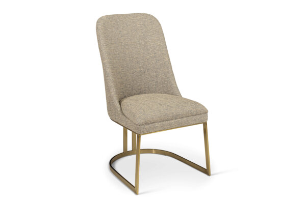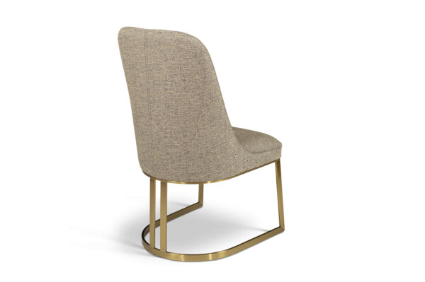 Baza sa sculpturală din alamă satinată adaugă o notă prețioasă, fără a domina vizual spațiul, un detaliu ce reflectă perfect echilibrul între modernitate și clasic. Forma rotunjită a spătarului și a cadrului metalic promite o susținere confortabilă, dar și o prezență grafică remarcabilă.