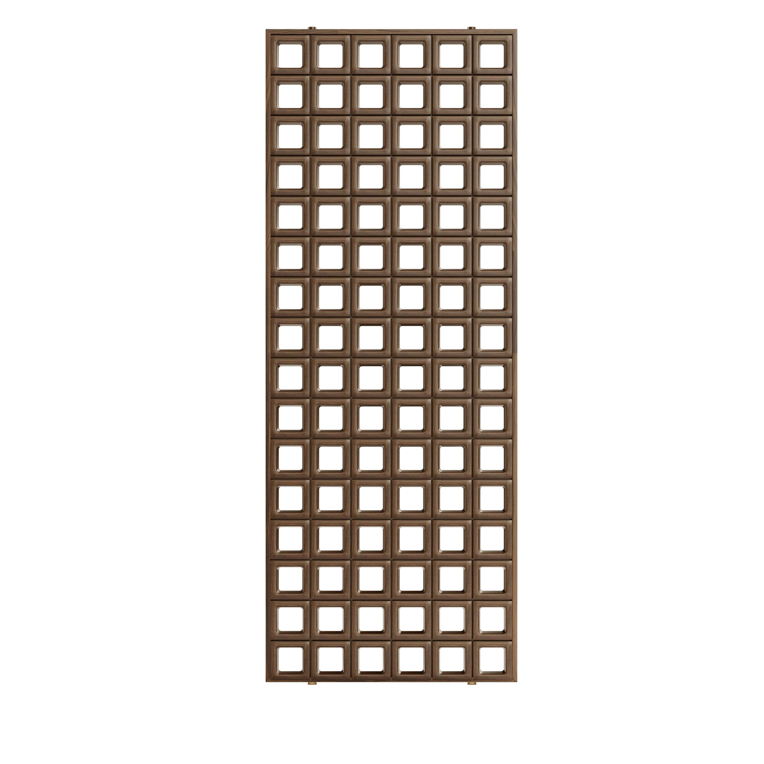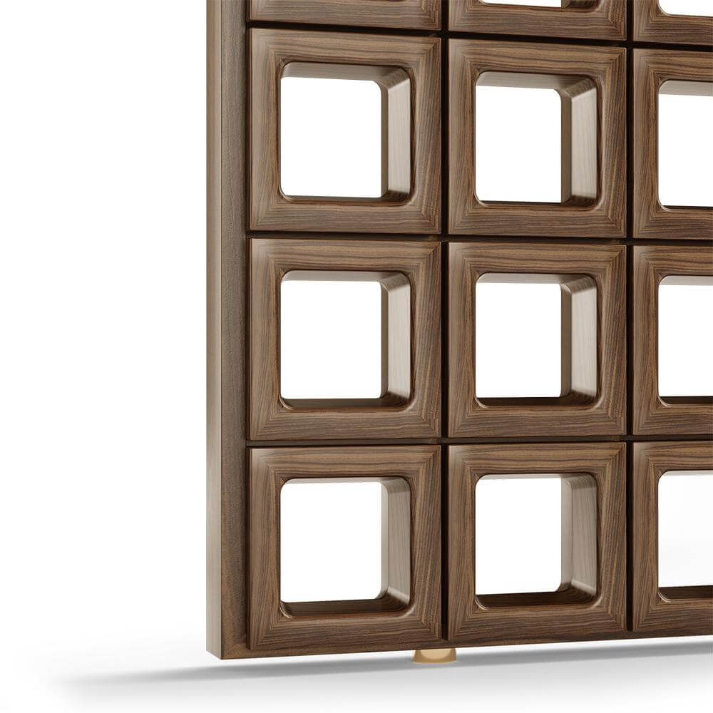 Inspirat de formele organice ale lemnului de nuc, separatorul decorativ Bogart explorează echilibrul dintre trecut și prezent. Structura sa compusă din panouri perforate cu decupaje pătrate creează o siluetă distinctivă, în care fiecare detaliu este gândit cu atenție. Prin aceste deschideri, lumina trece dintr-un spațiu în altul, extinzând vizual ambientul și accentuând legătura dintre zonele delimitate.