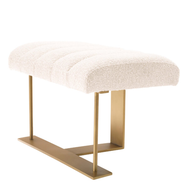 Acest taburet elegant oferă un loc suplimentar cu un design unic. Structura cu finisaj de alamă periată are o picior pe o parte și două pe cealaltă, susținând un șezut acoperit cu țesătură bogată bouclé crem, decorat cu cusături canalizate.
