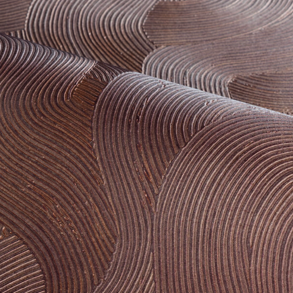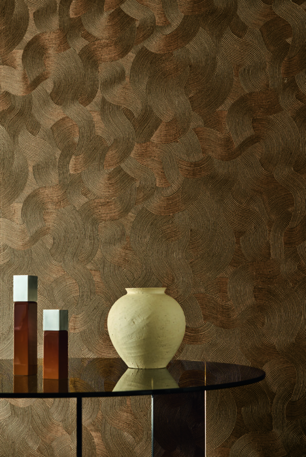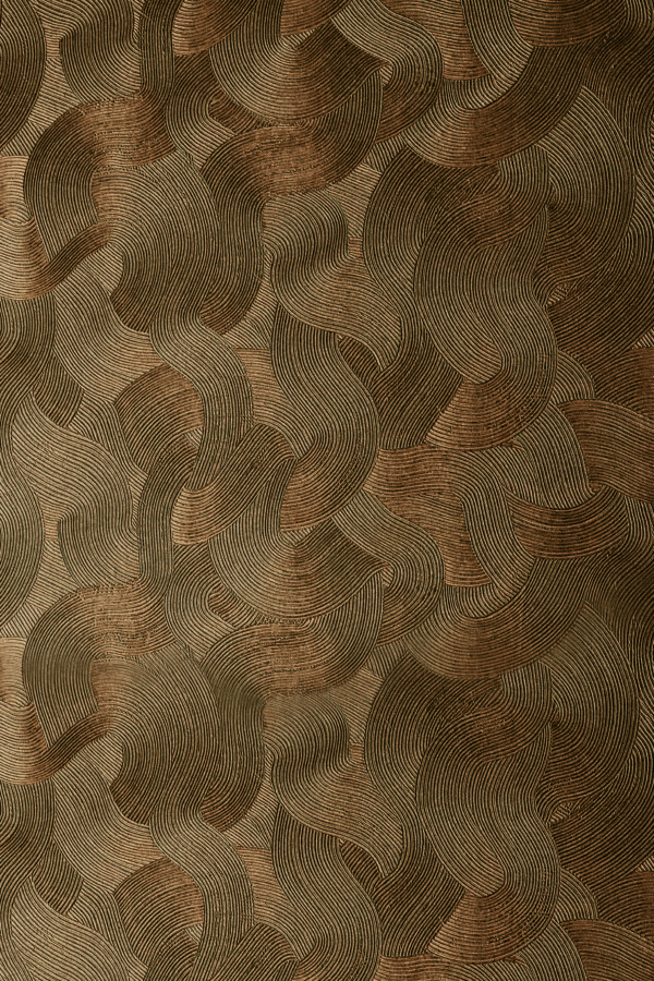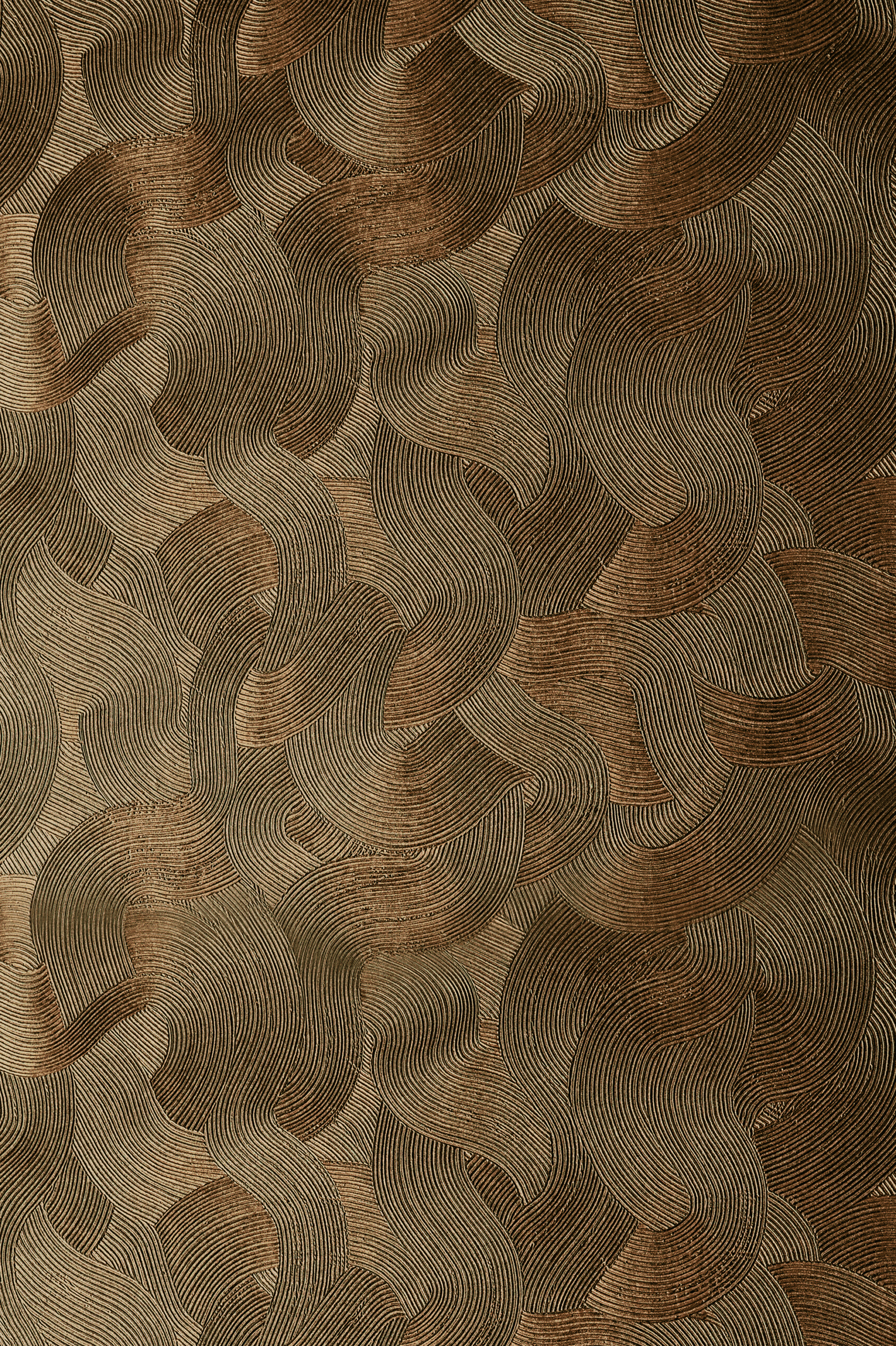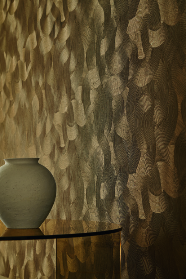 Textura sa creează o suprafață vibrantă, animată de forme curbe care captează lumina. Neregularitățile îi oferă profunzime vizuală și tactilă, evidențiată prin accente metalice. Designul este realizat prin aplicarea de cerneluri aurii, argintii sau sidefate peste o bază simplă, colorată.