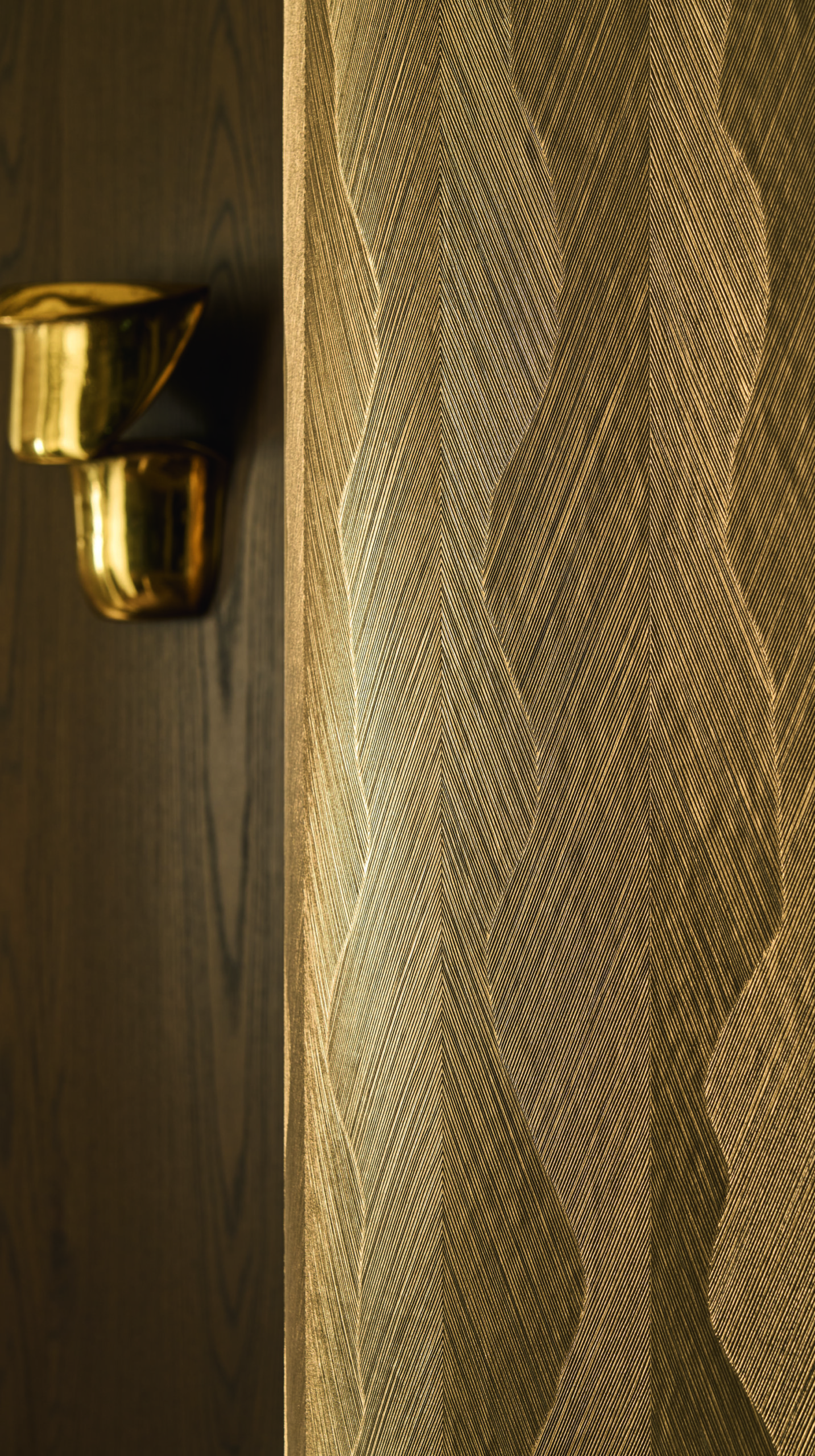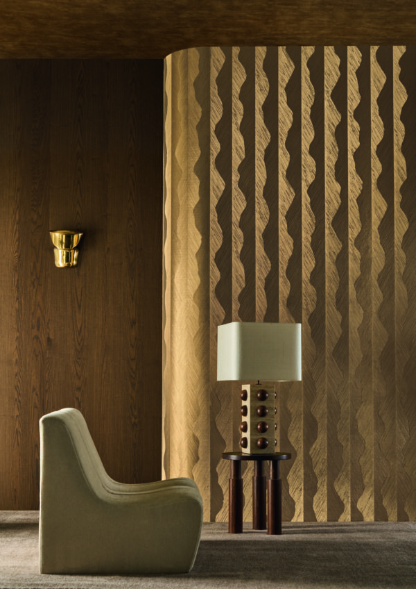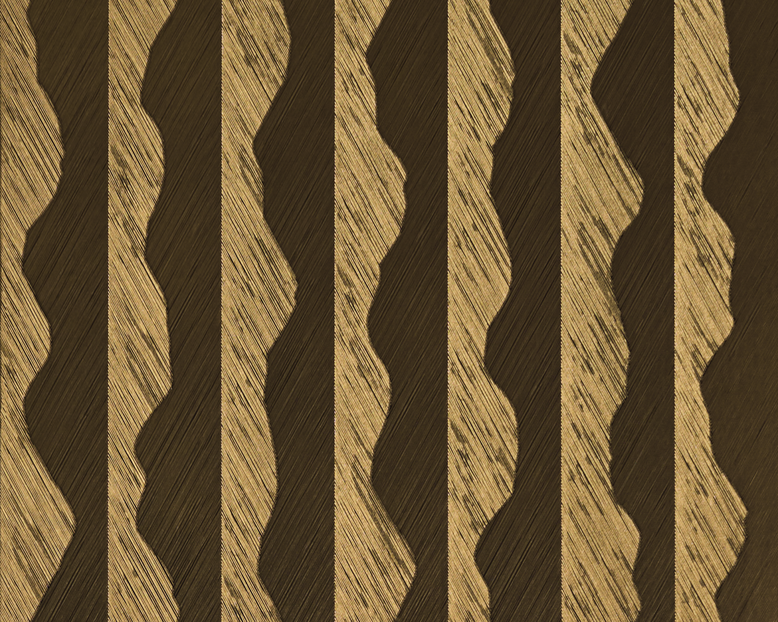 Textura sa creează o suprafață vibrantă, animată de forme curbe care captează lumina. Neregularitățile îi oferă profunzime vizuală și tactilă, evidențiată prin accente metalice. Designul este realizat prin aplicarea de cerneluri aurii, argintii sau sidefate peste o bază simplă, colorată.