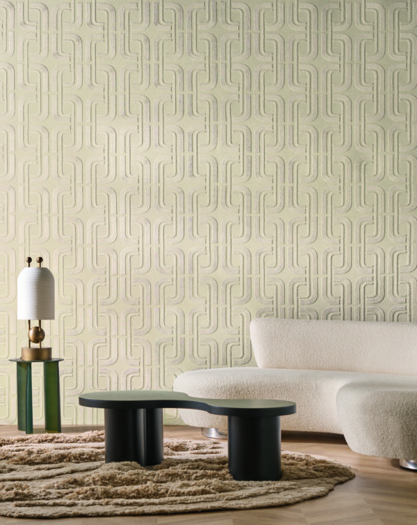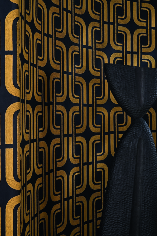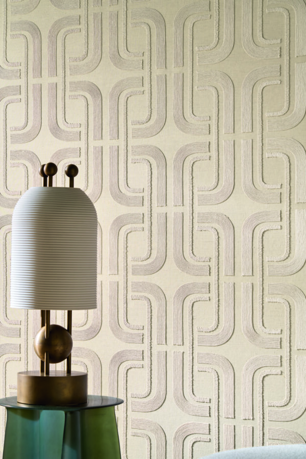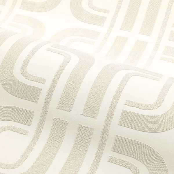 Modelul subliniază liniile subtile și simetria lor armonioasă, iar formele geometrice suprapuse sunt create printr-un fir sidefat brodat pe o bază din in și bumbac. Unghiurile delicate și contururile fluide sunt trasate de mișcarea continuă și grațioasă a firului. Colecția este disponibilă într-o paletă de nuanțe sofisticate, îmbinând alb cu blanc și ivoire, craie cu ivoire, dar și le noir cu mordoré.